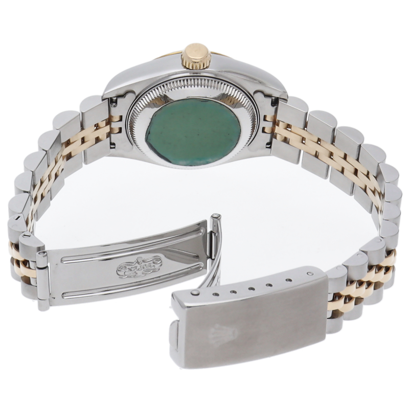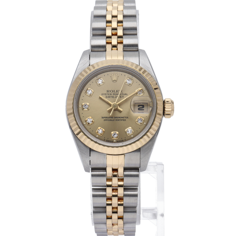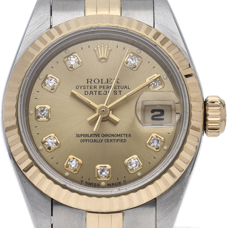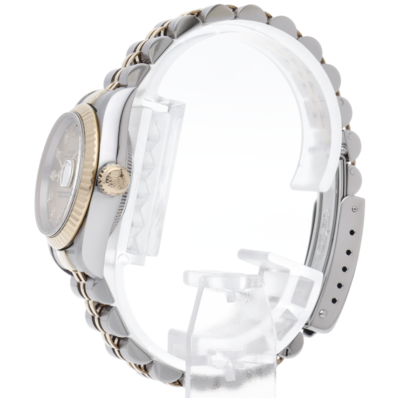 ロレックスのドレスウォッチで幅広い年齢層に愛されているデイトジャスト。イエローゴールドとステンレスのコンビ仕様に10Pダイヤが施され豪華です。