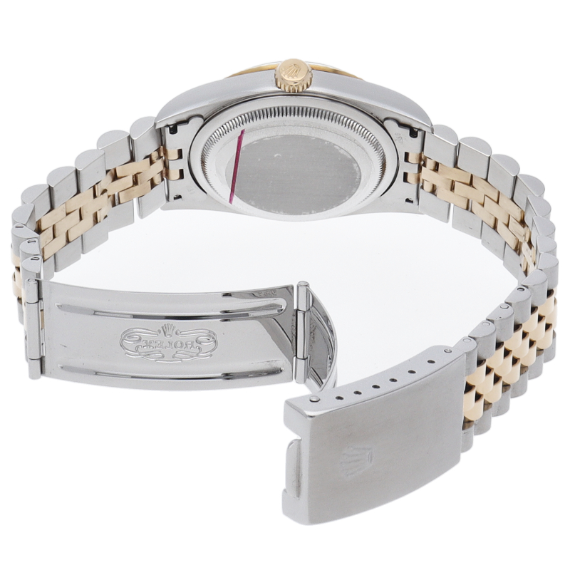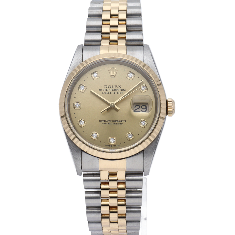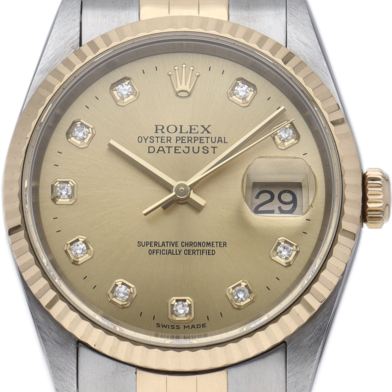 ロレックスのドレスウォッチで幅広い年齢層に愛されている「デイトジャスト」。イエローゴールドとステンレスのコンビ仕様に10Pダイヤが施されております。