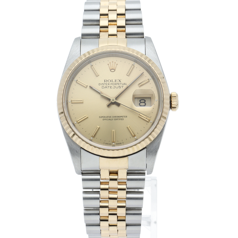 ロレックスのドレスウォッチの王道「デイトジャスト」。イエローゴールドとステンレスの組み合わせが上品で高級感を感じさせる1本です。