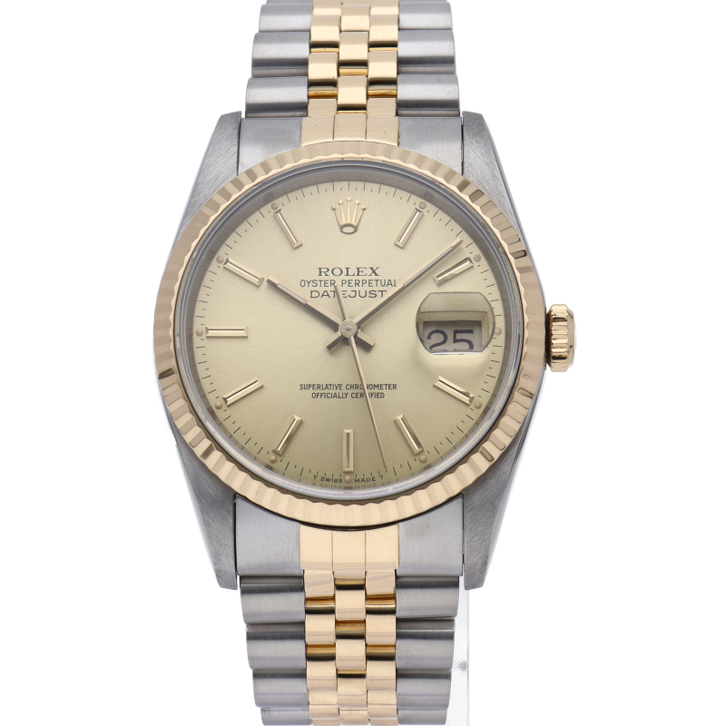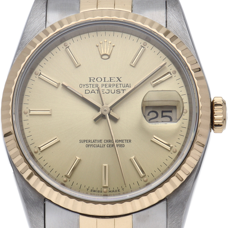 ロレックスのドレスウォッチの王道「デイトジャスト」。イエローゴールドとステンレスの組み合わせが上品で高級感を感じさせる1本です。