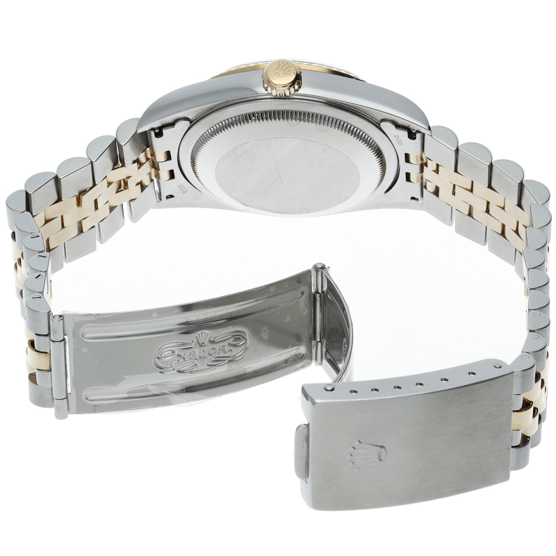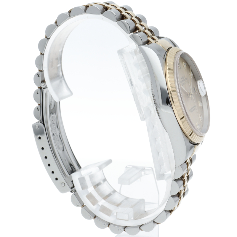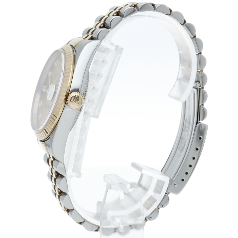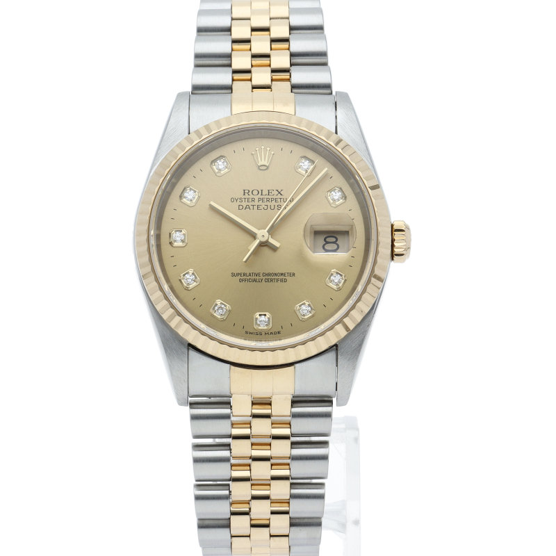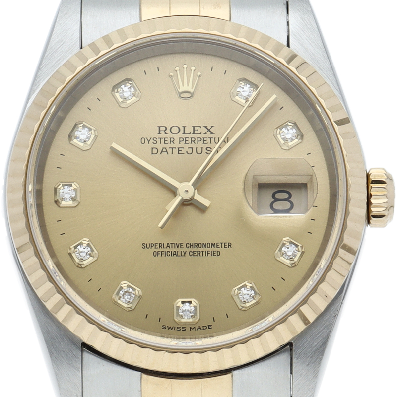 ロレックスのドレスウォッチで幅広い年齢層に愛されている「デイトジャスト」。イエローゴールドとステンレスのコンビ仕様に10Pダイヤが施されております。