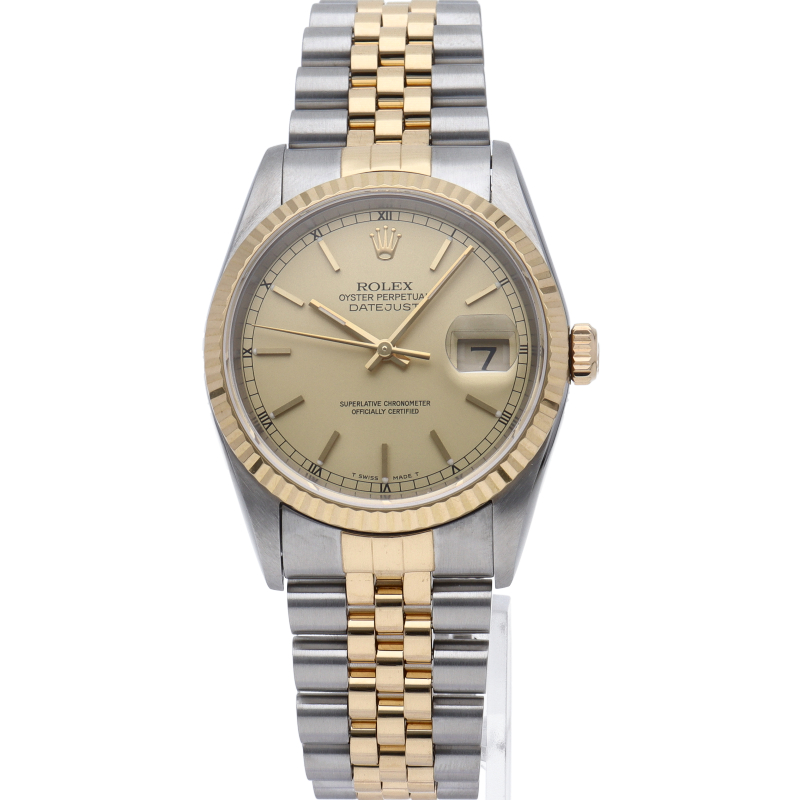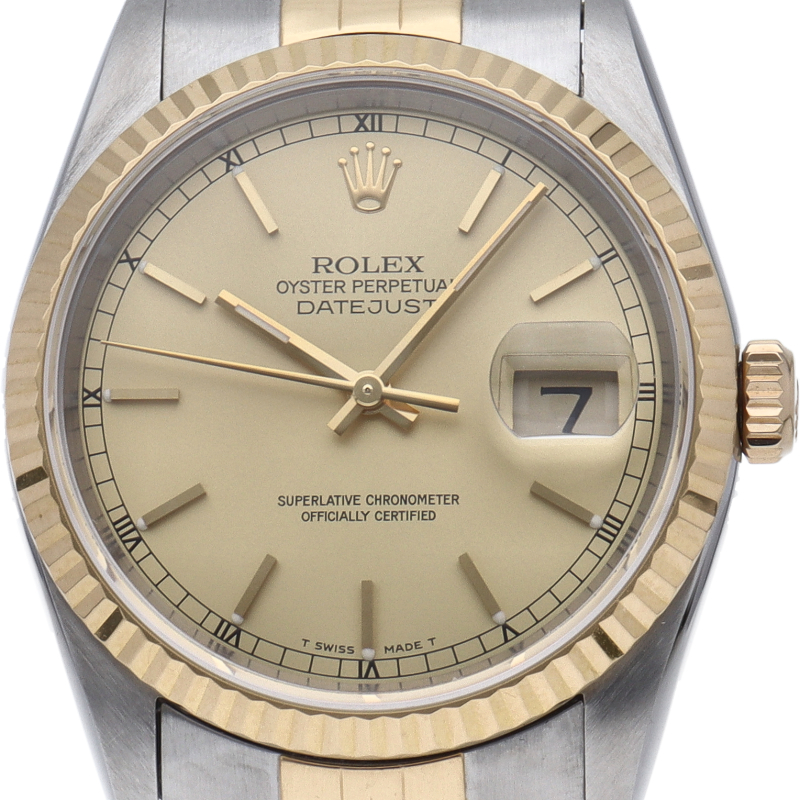 ロレックスのドレスウォッチの王道「デイトジャスト」。イエローゴールドとステンレスの組み合わせが上品で高級感を感じさせる1本です。