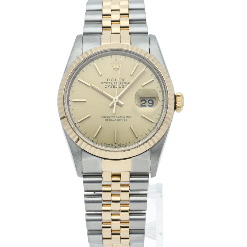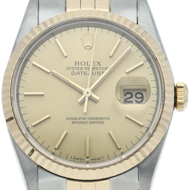 ロレックスのドレスウォッチの王道「デイトジャスト」。イエローゴールドとステンレスの組み合わせが上品で高級感を感じさせる1本です。