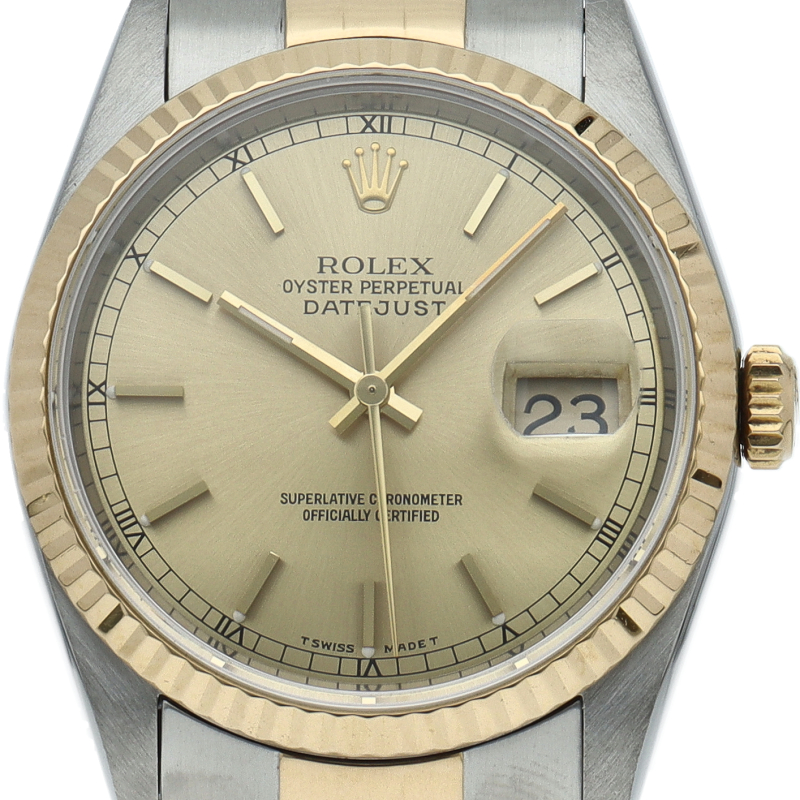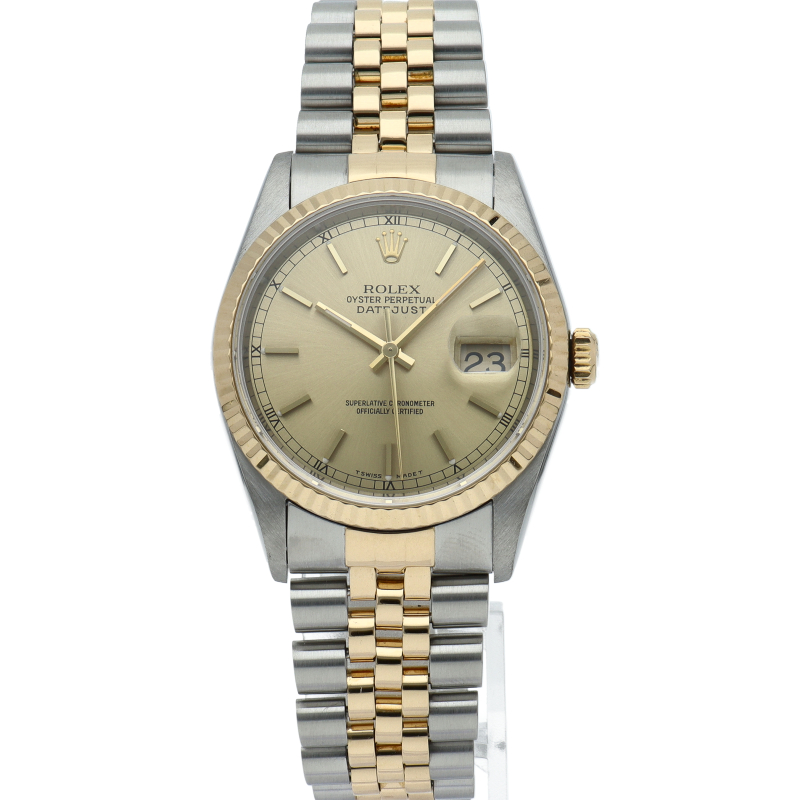 ロレックスのドレスウォッチの王道「デイトジャスト」。イエローゴールドとステンレスの組み合わせが上品で高級感を感じさせる1本です。