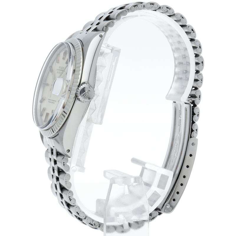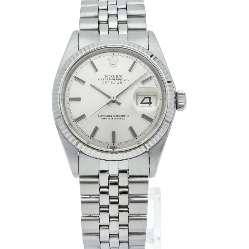 ロレックスのドレスウォッチの王道「デイトジャスト」。ホワイトゴールドとステンレスの組み合わせが高級感を感じさせる1本です。プラスチック風防仕様。