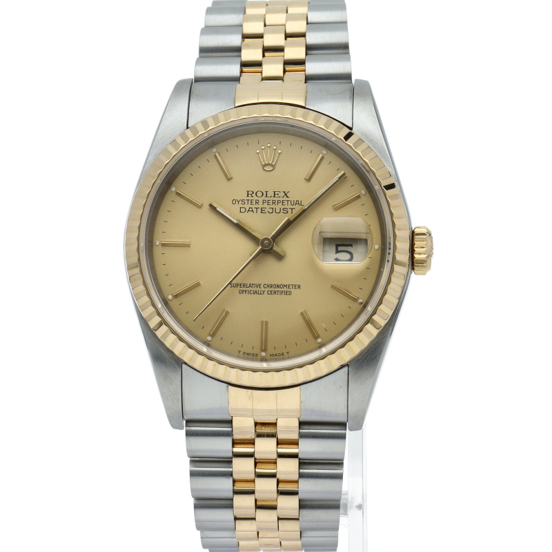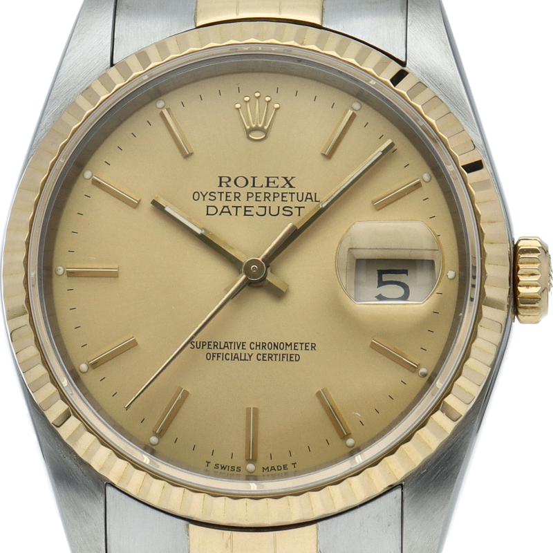 ロレックスのドレスウォッチの王道「デイトジャスト」。イエローゴールドとステンレスの組み合わせが上品で高級感を感じさせる1本です。