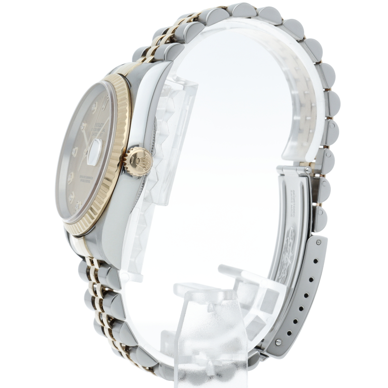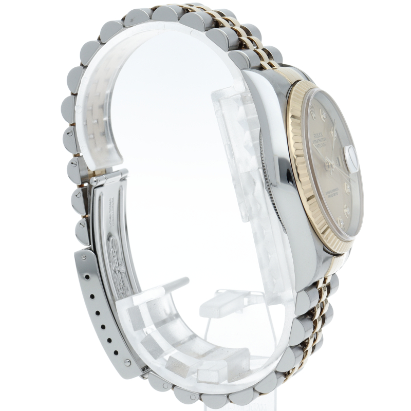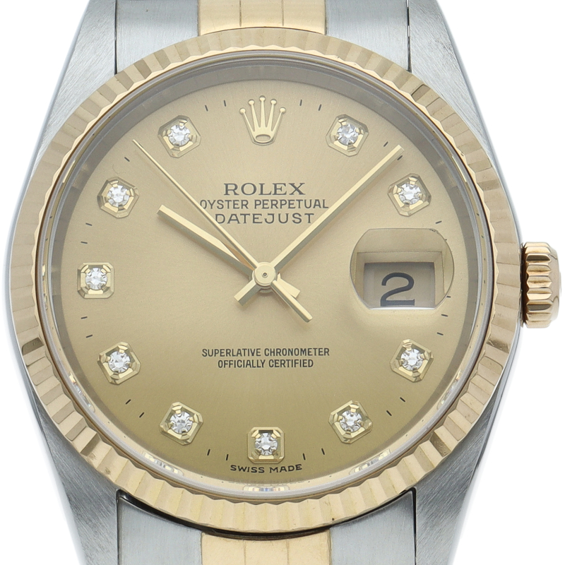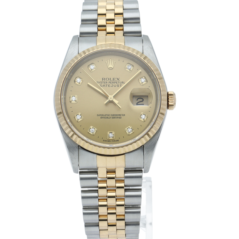 ロレックスのドレスウォッチで幅広い年齢層に愛されている「デイトジャスト」。イエローゴールドとステンレスのコンビ仕様に10Pダイヤが施されております。