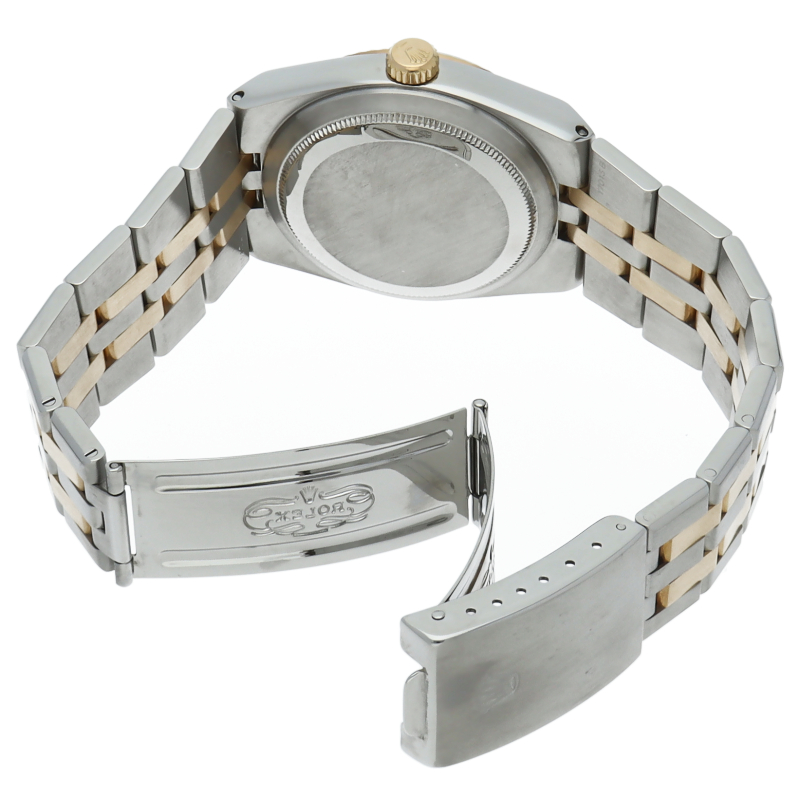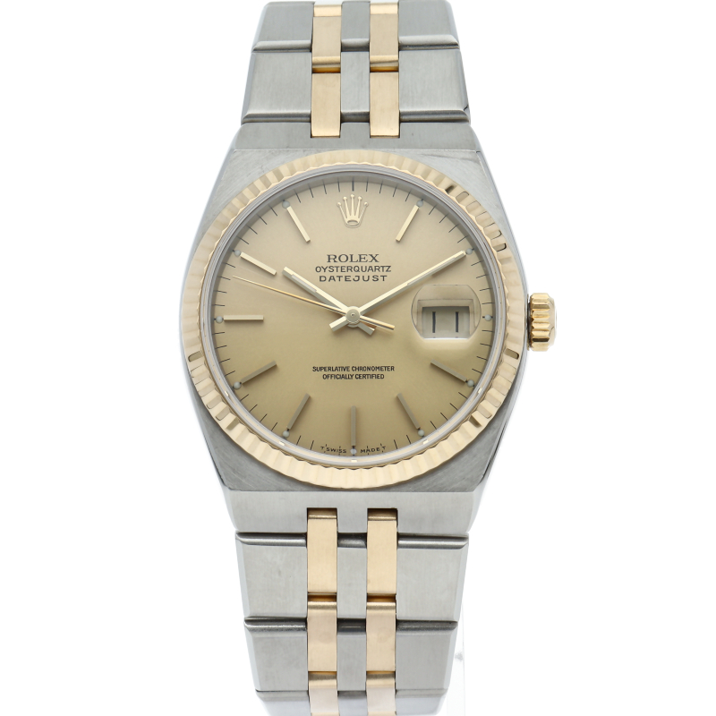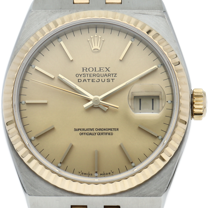 「デイトジャスト」のクォーツ仕様という珍しいモデルで「オイスタークォーツ」です。現行にはない直線的なケースとブレスのフォルムが印象的で貴重な1本。