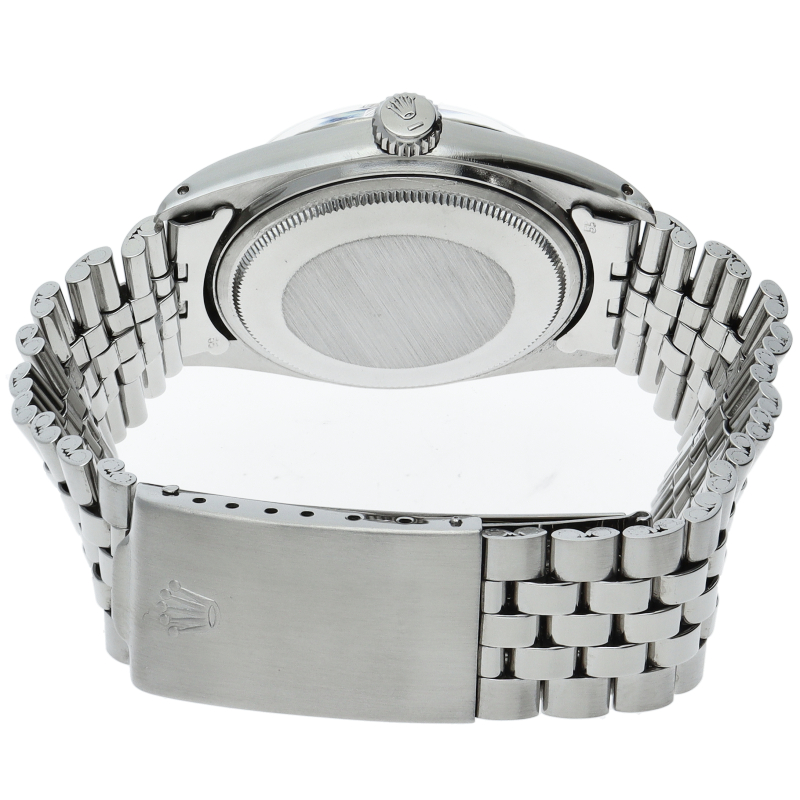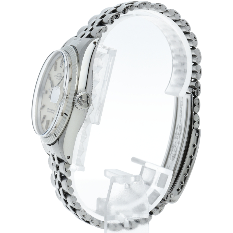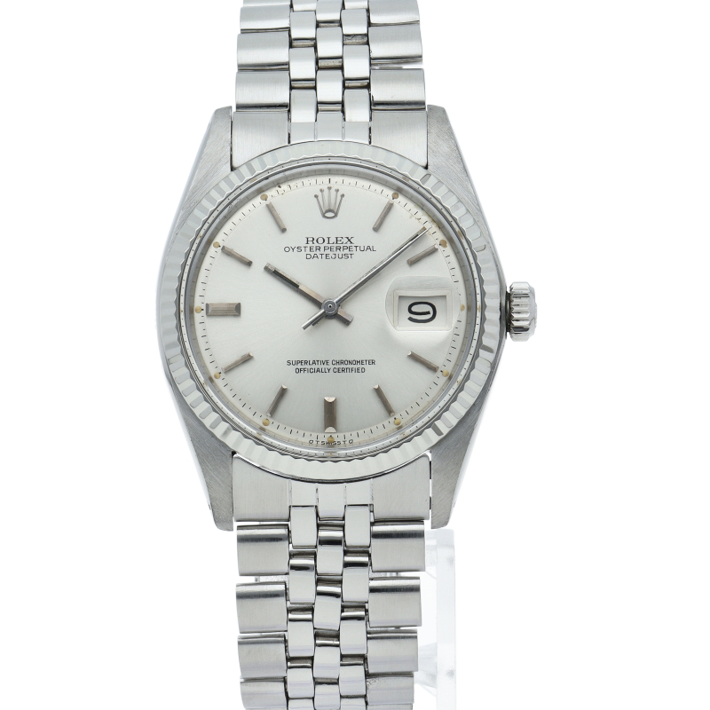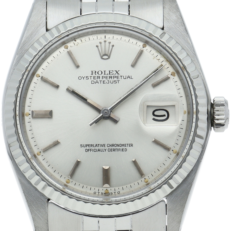 ロレックスのドレスウォッチの王道「デイトジャスト」。ホワイトゴールドとステンレスの組み合わせが高級感を感じさせる1本です。プラスチック風防仕様。6時位置にインデックス等に貴金属が使用されている事を表すシグママークが入った、希少性・高級感の非常に高い1本です。