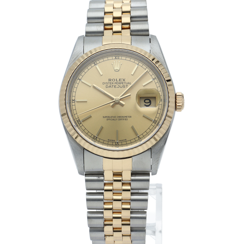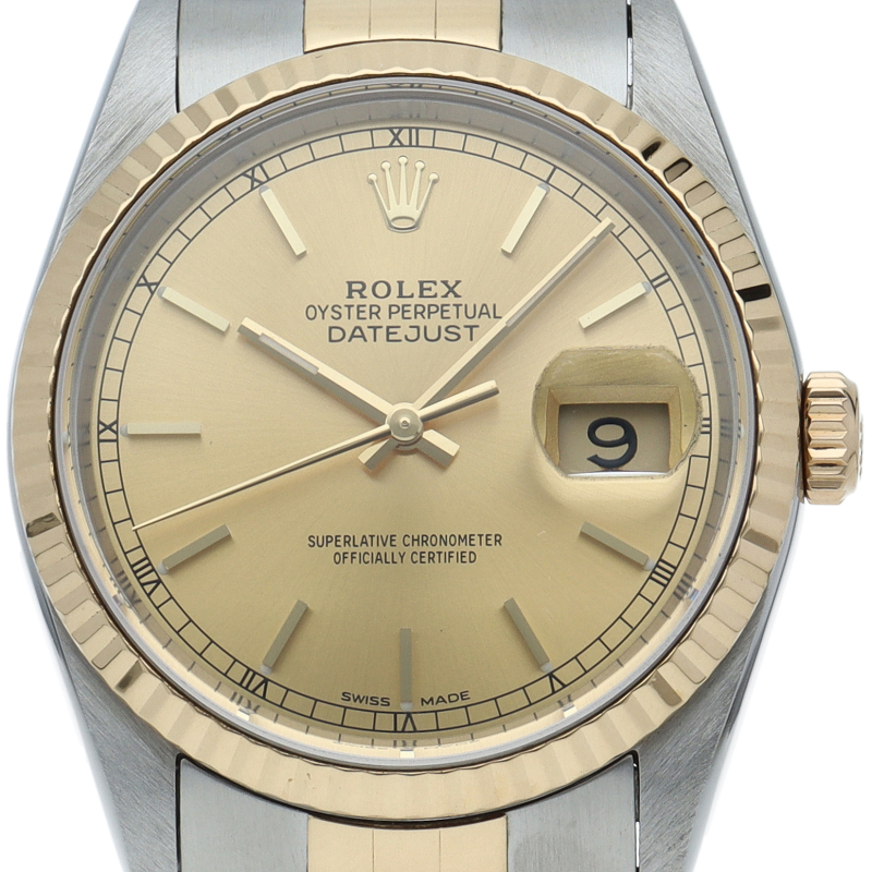 ロレックスのドレスウォッチの王道「デイトジャスト」。イエローゴールドとステンレスの組み合わせが上品で高級感を感じさせる1本です。