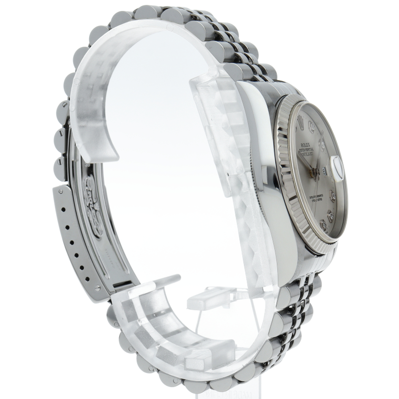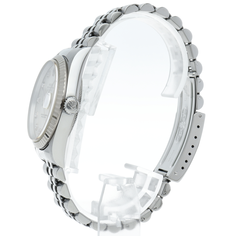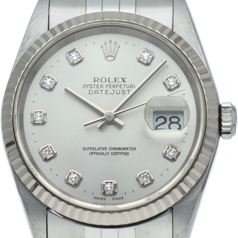 ロレックスのドレスウォッチで幅広い年齢層に愛されている「デイトジャスト」。ホワイトゴールドとステンレスのコンビ仕様に10Pダイヤが施されております。