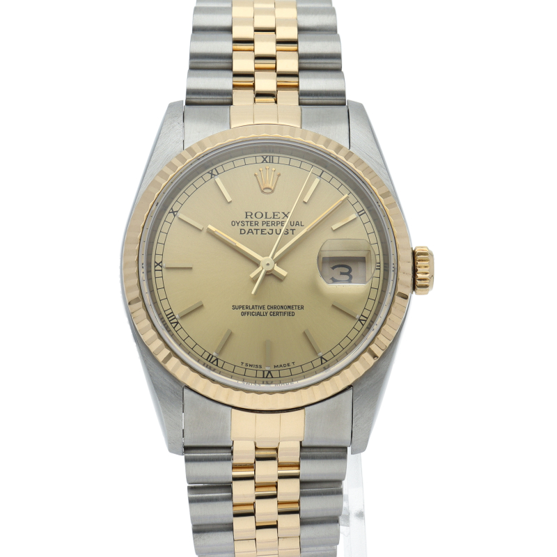 ロレックスのドレスウォッチの王道「デイトジャスト」。イエローゴールドとステンレスの組み合わせが上品で高級感を感じさせる1本です。
