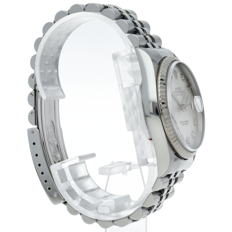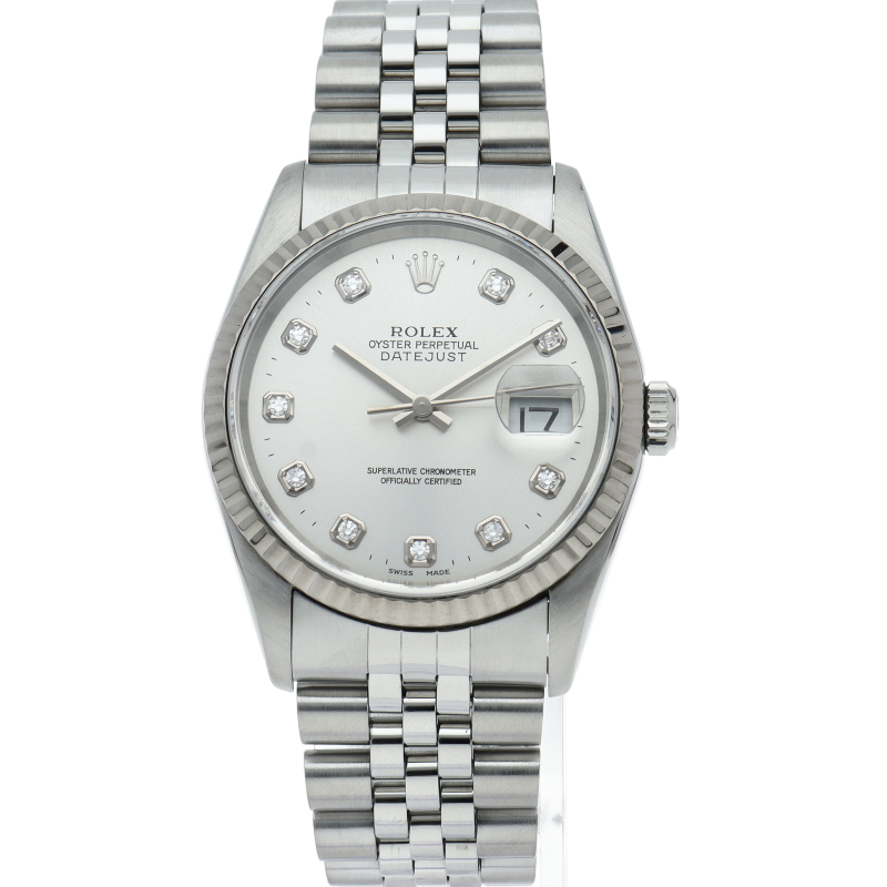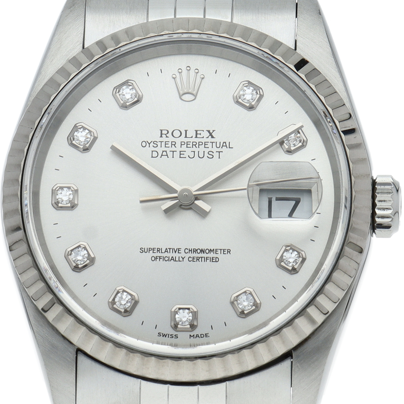 ロレックスのドレスウォッチで幅広い年齢層に愛されている「デイトジャスト」。ホワイトゴールドとステンレスのコンビ仕様に10Pダイヤが施されております。