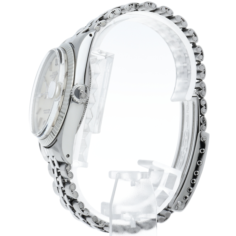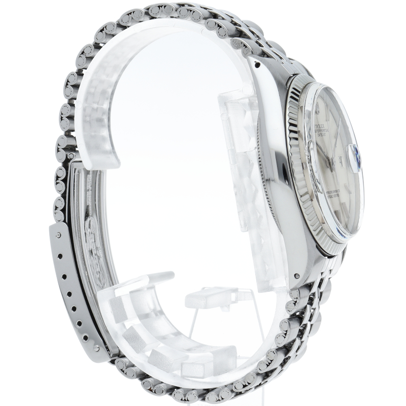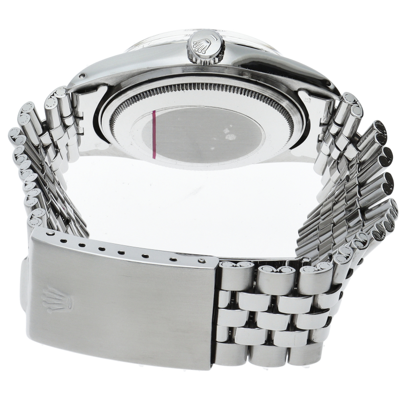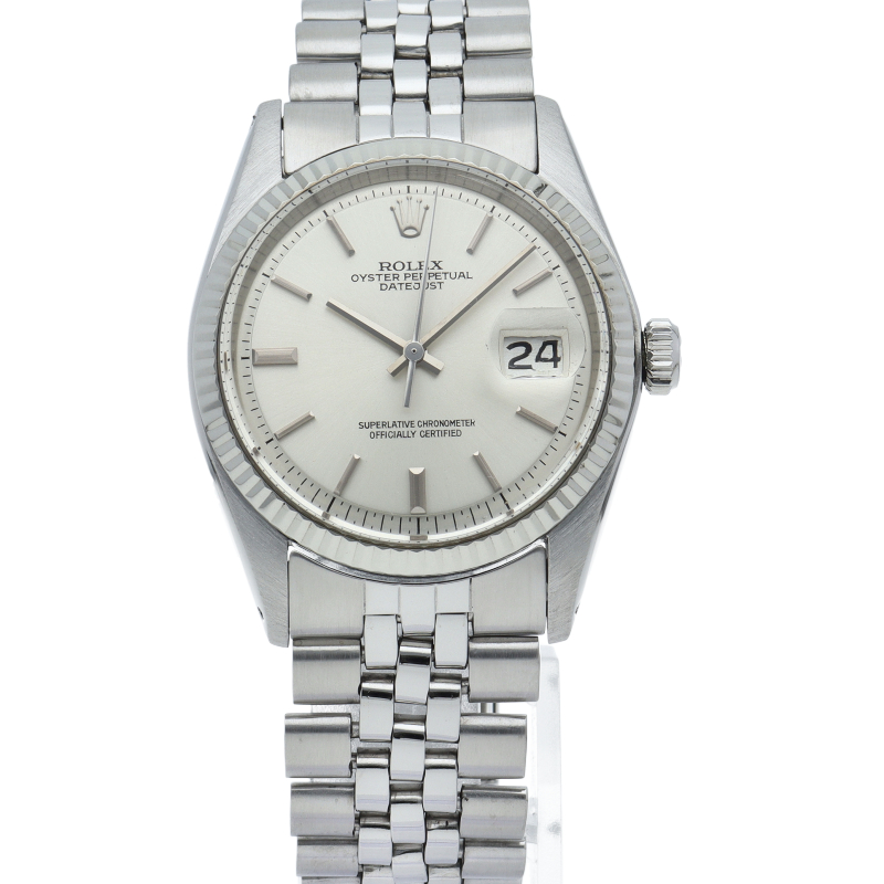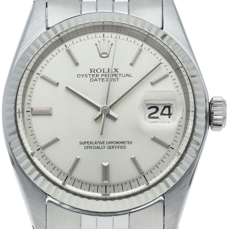 ロレックスのドレスウォッチの王道「デイトジャスト」。ホワイトゴールドとステンレスの組み合わせが高級感を感じさせる1本です。プラスチック風防仕様。6時位置にインデックス等に貴金属が使用されている事を表すシグママークが入った、希少性・高級感の非常に高い1本です。