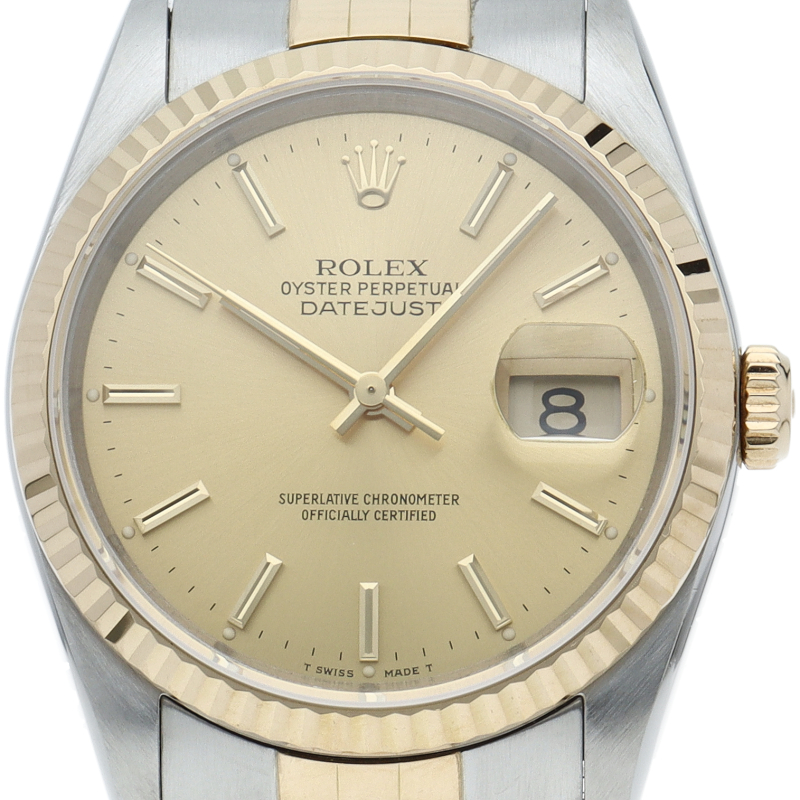 ロレックスのドレスウォッチの王道「デイトジャスト」。イエローゴールドとステンレスの組み合わせが上品で高級感を感じさせる1本です。