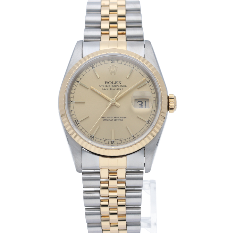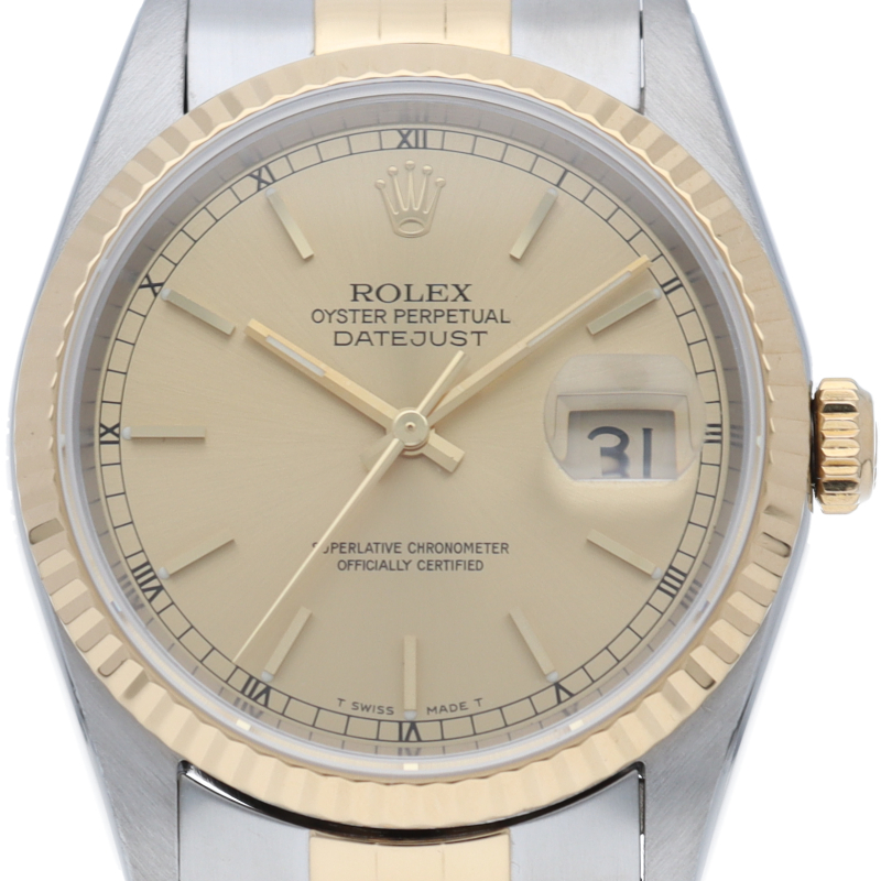 ロレックスのドレスウォッチの王道「デイトジャスト」。イエローゴールドとステンレスの組み合わせが上品で高級感を感じさせる1本です。