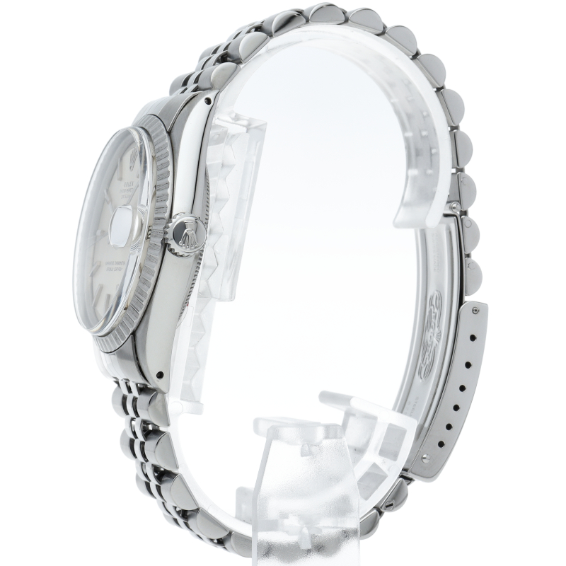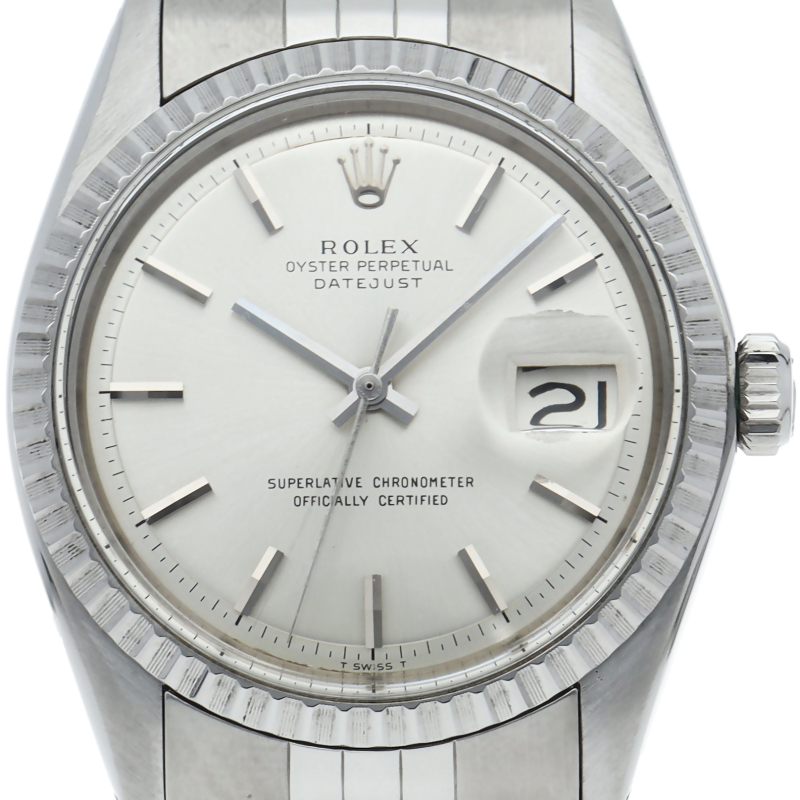 ロレックスのドレスウォッチの王道「デイトジャスト」。エンジンターンドベゼルのアンティーク感が逆に新鮮な1本。