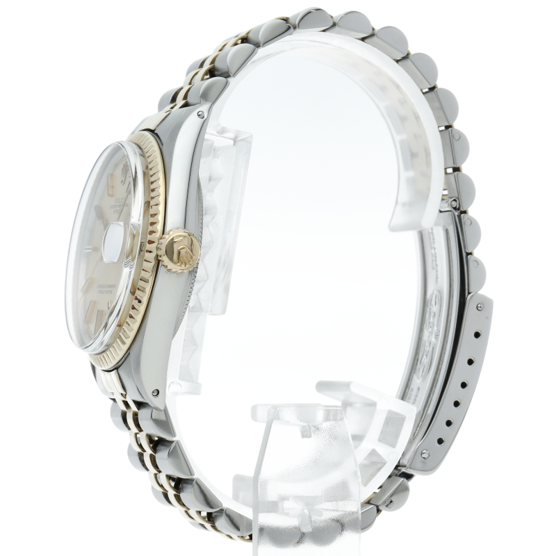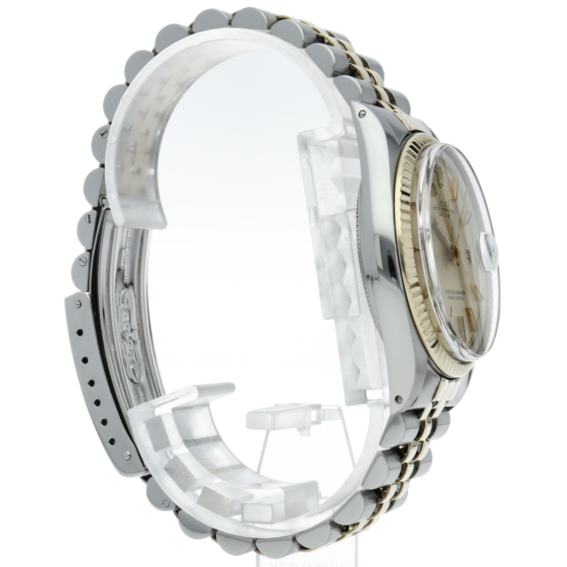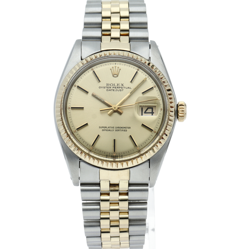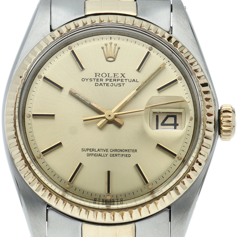 ロレックスのドレスウォッチの王道「デイトジャスト」。イエローゴールドとステンレスの組み合わせが高級感を感じさせる1本です。プラスチック風防仕様。1601/3。クロノメーター表記の中央の空間が揃っている「センタースプリット」となっています。