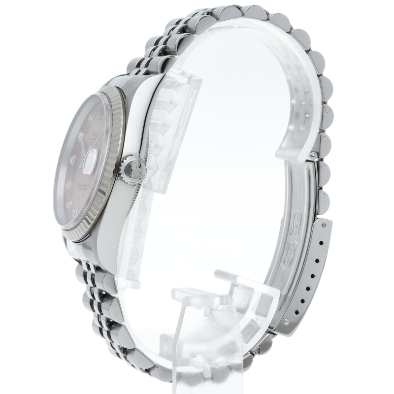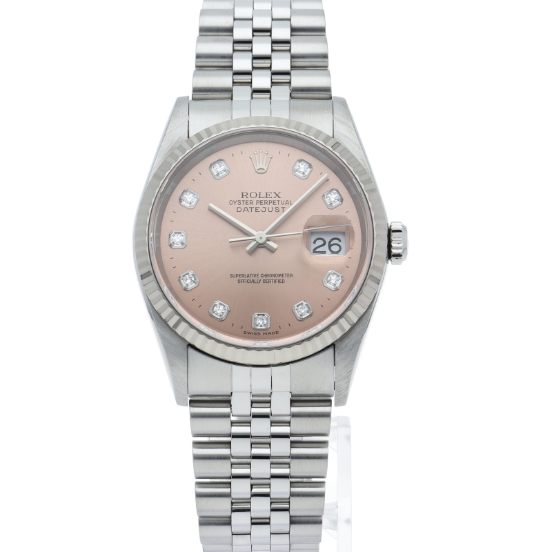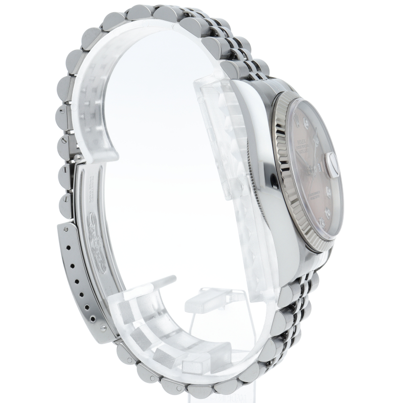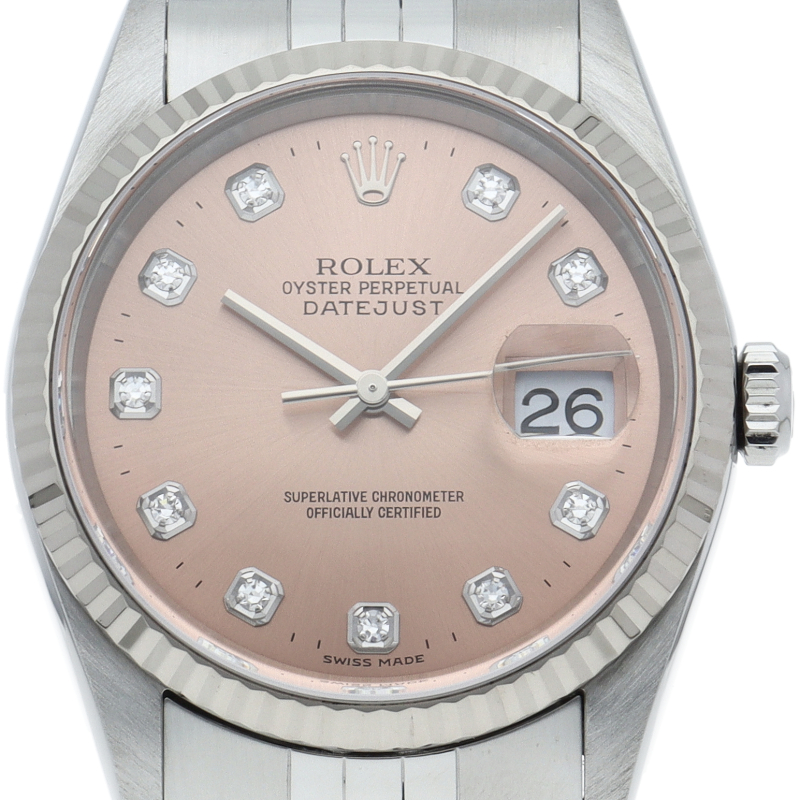 ロレックスのドレスウォッチの王道「デイトジャスト」。ホワイトゴールドとステンレスの組み合わせが上品で高級感を感じさせる1本です。10Pダイヤが使用された上品なデザインです。