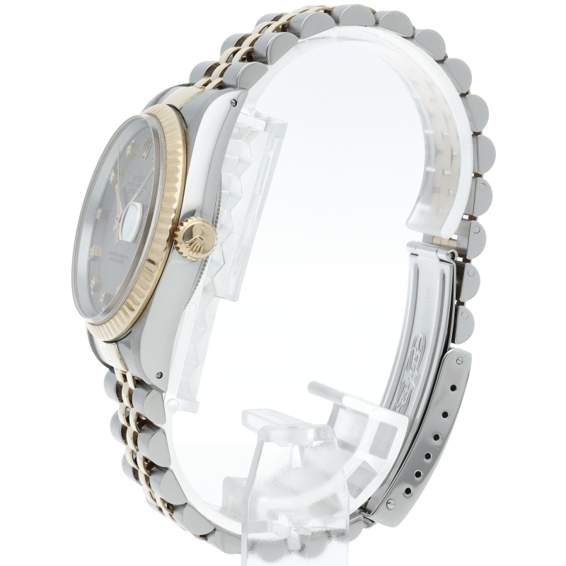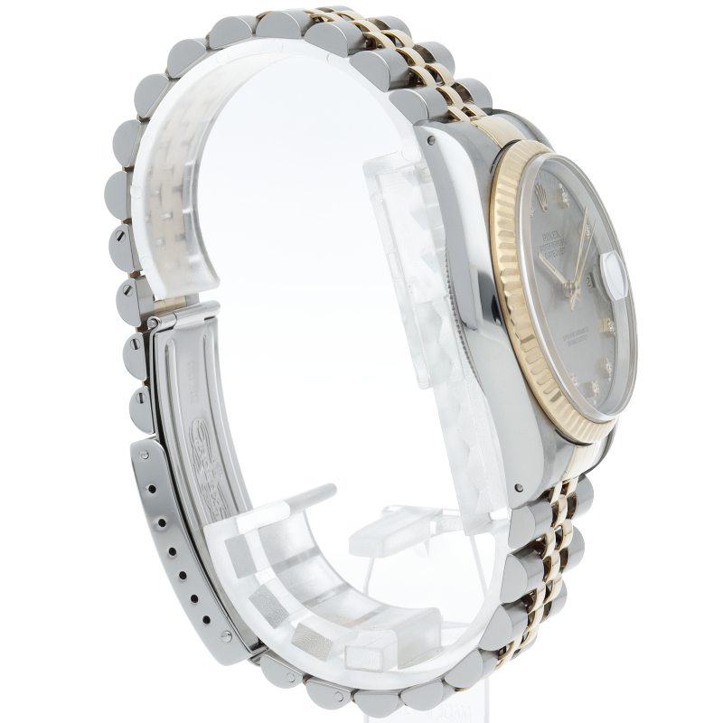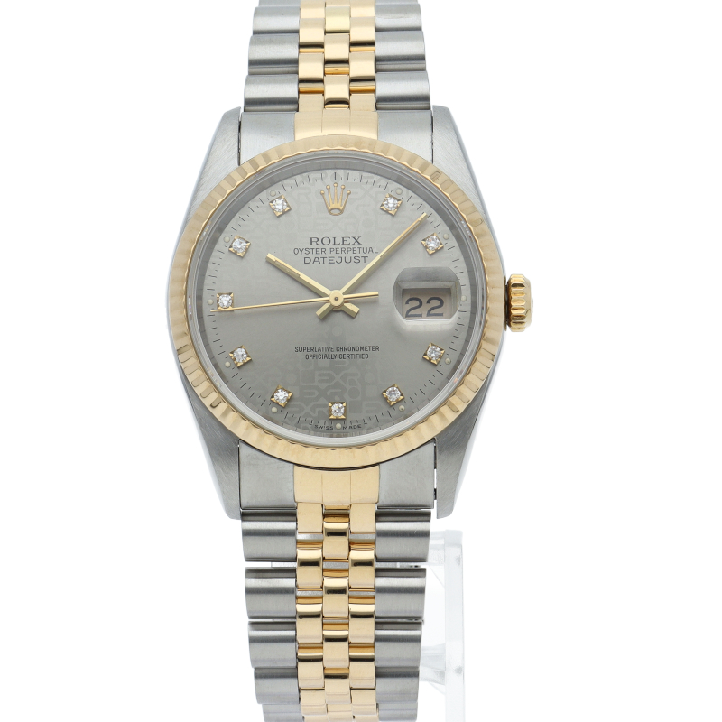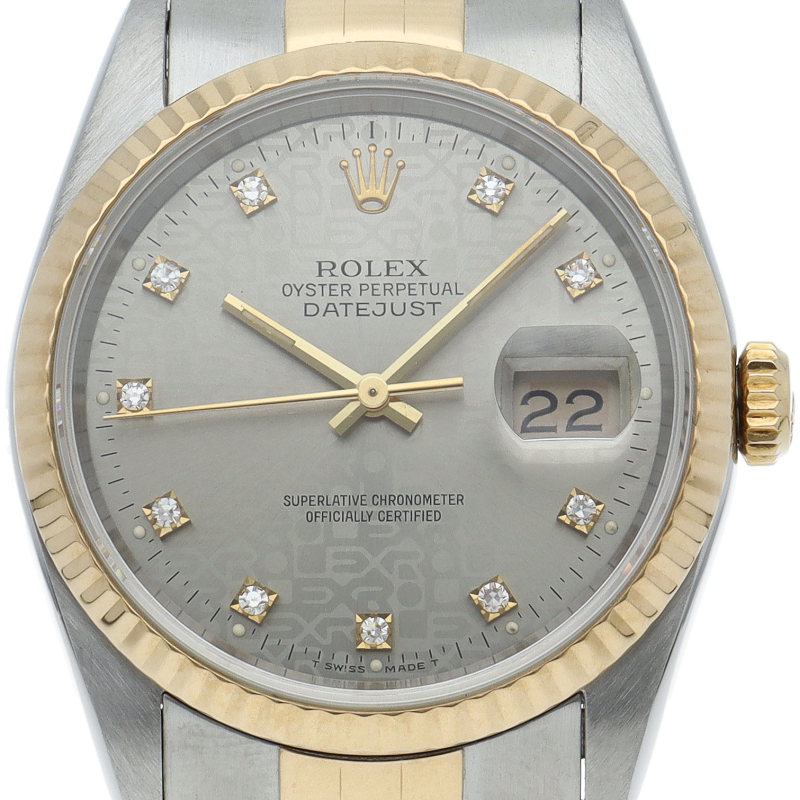 ロレックスのドレスウォッチで幅広い年齢層に愛されている「デイトジャスト」。イエローゴールドとステンレスのコンビ仕様に10Pダイヤが施されております。