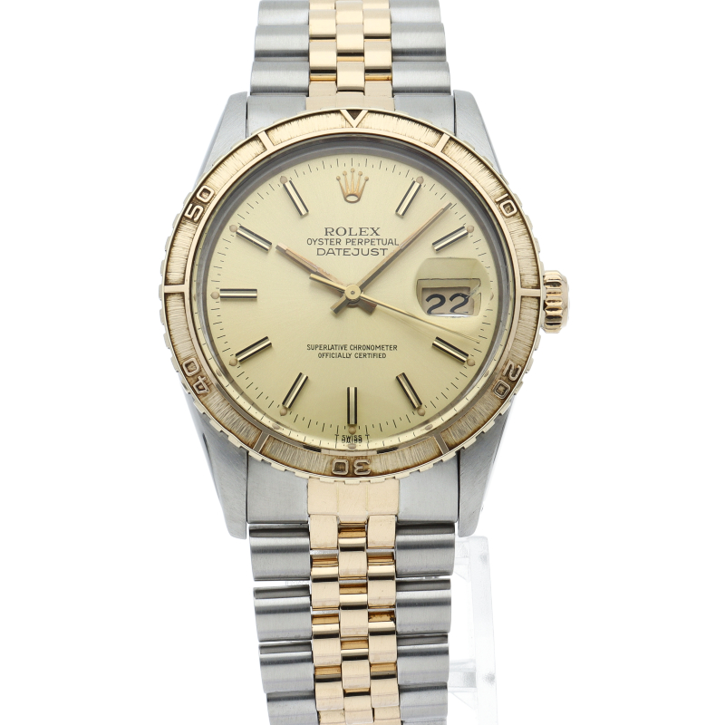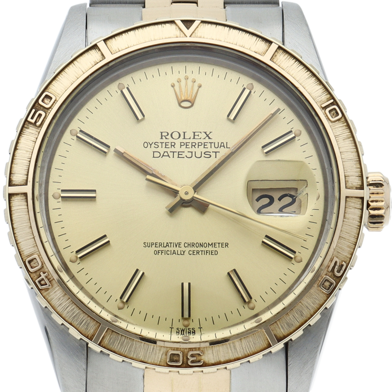 ロレックス人気モデル「デイトジャスト」にエンジンターンドベゼルが装着された「サンダーバード」。生産終了後、根強い人気でこれからが楽しみな1本です。