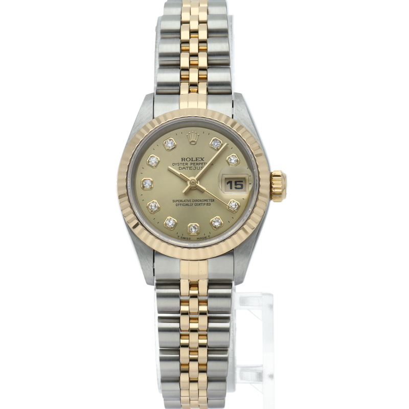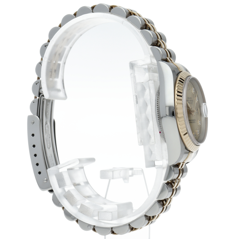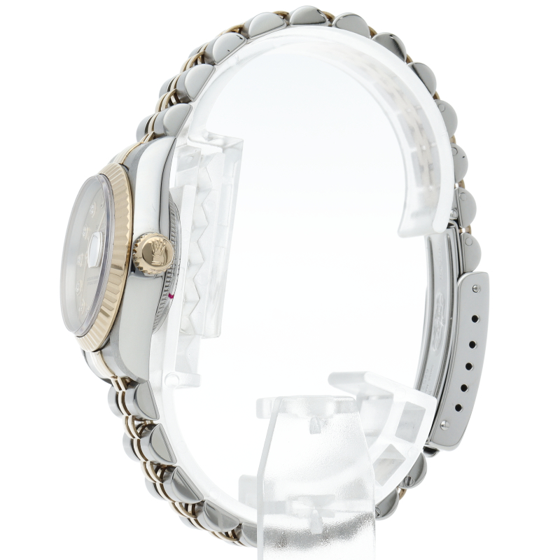 ロレックスのドレスウォッチで幅広い年齢層に愛されているデイトジャスト。イエローゴールドとステンレスのコンビ仕様に10Pダイヤが施され豪華です。