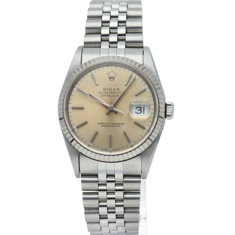 ロレックスのドレスウォッチの王道「デイトジャスト」。ホワイトゴールドとステンレスの組み合わせが上品で高級感を感じさせる1本です。