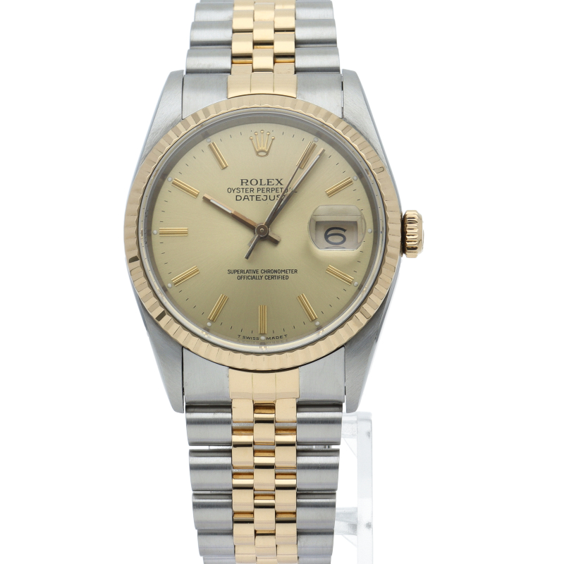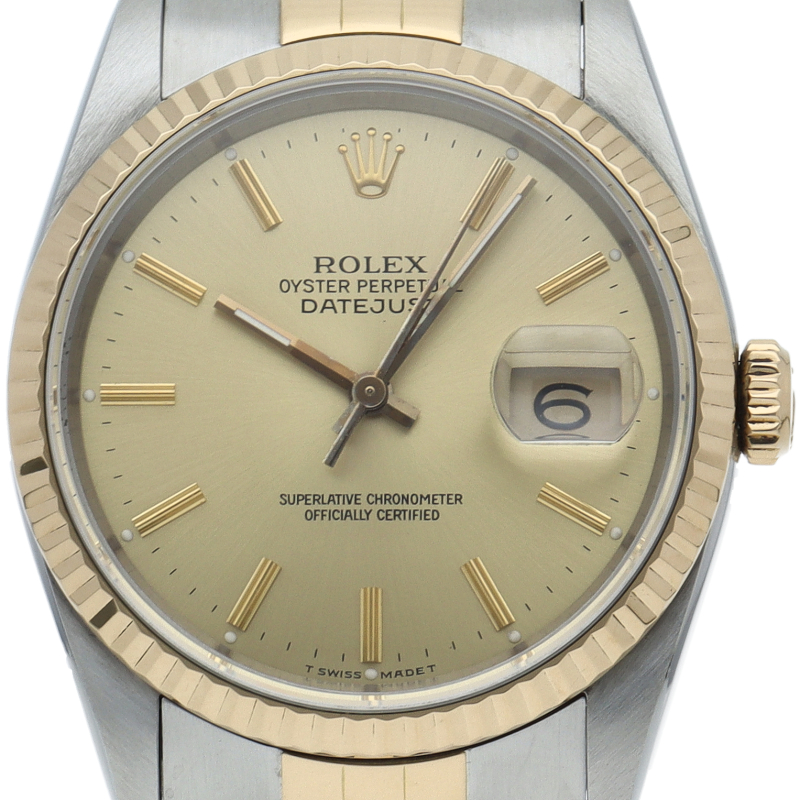 ロレックスのドレスウォッチの王道「デイトジャスト」。イエローゴールドとステンレスの組み合わせが上品で高級感を感じさせる1本です。