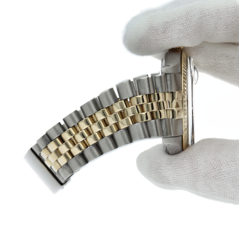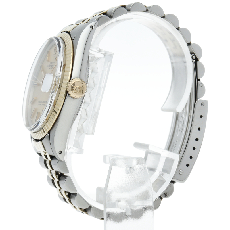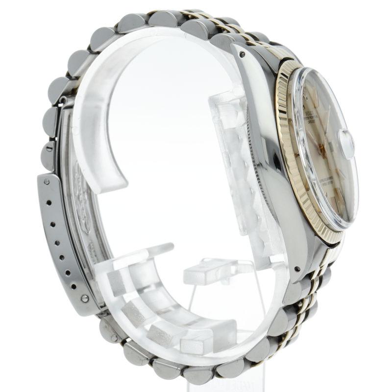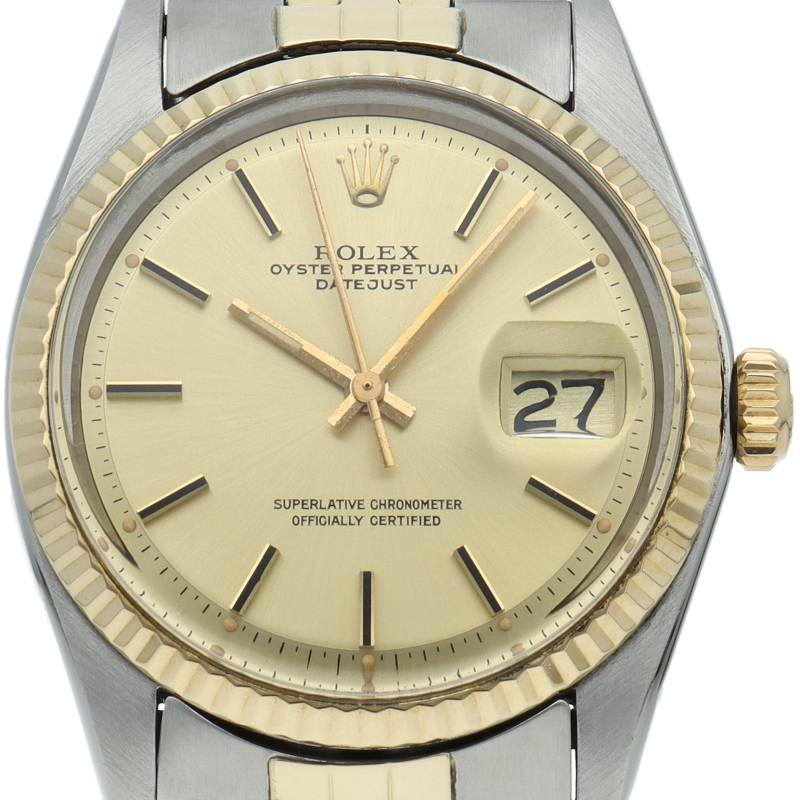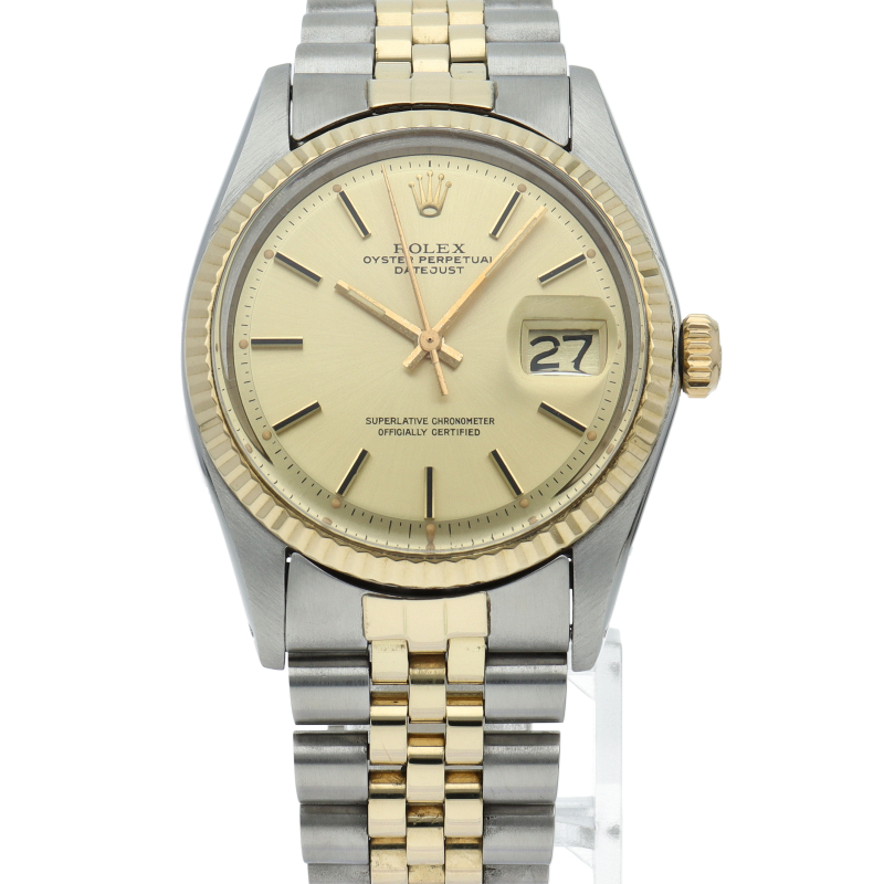 ロレックスのドレスウォッチの王道「デイトジャスト」。ホワイトゴールドとステンレスの組み合わせが高級感を感じさせる1本です。プラスチック風防仕様。クロノメーター表記の中央の空間が揃っている「センタースプリット」となっています。1601/3。