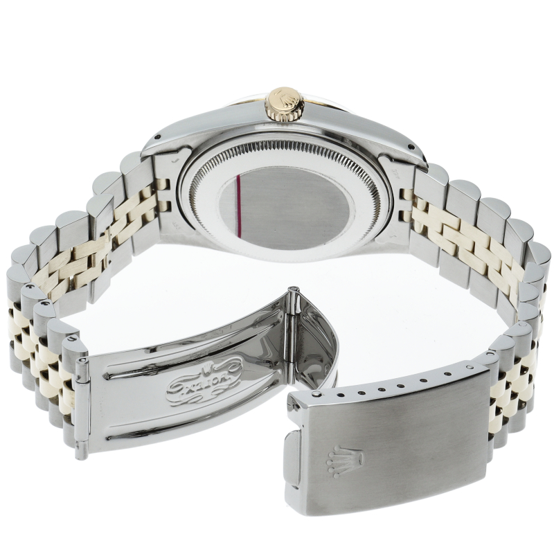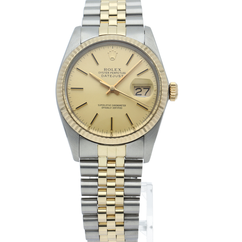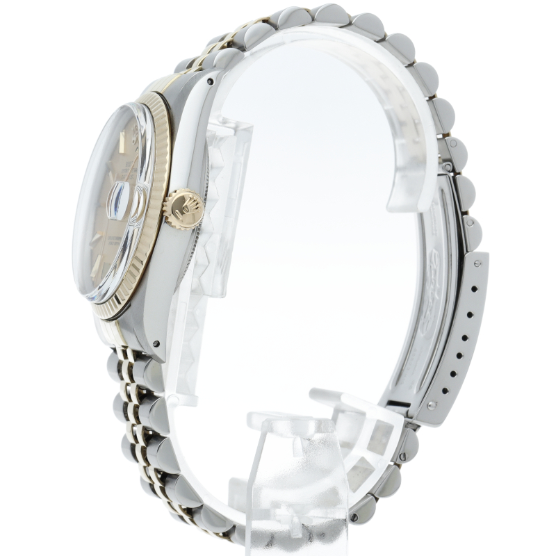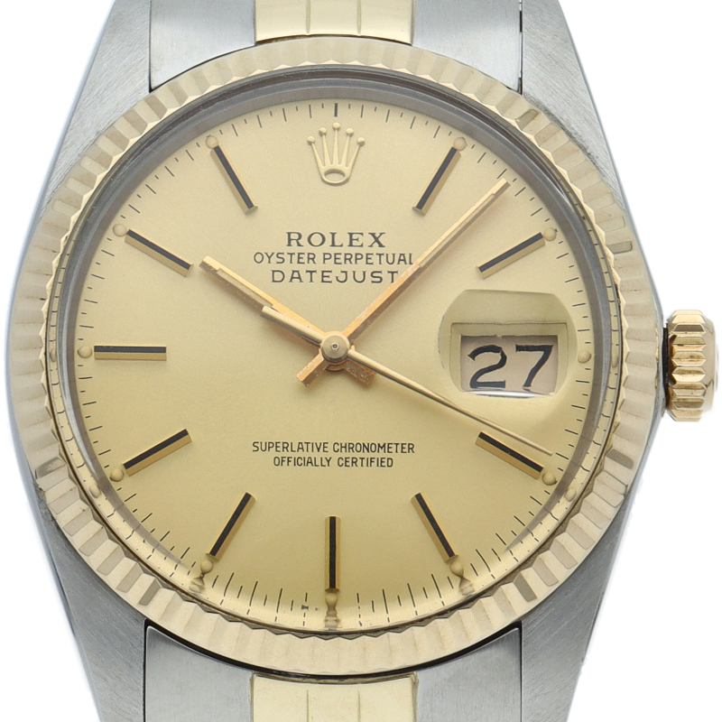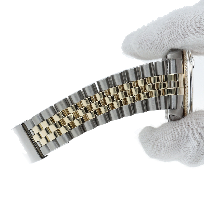ロレックスドレスウォッチの王道「デイトジャスト」。イエローゴールドとステンレスの組み合わせが高級感を感じさせる1本です。プラスチック風防仕様。