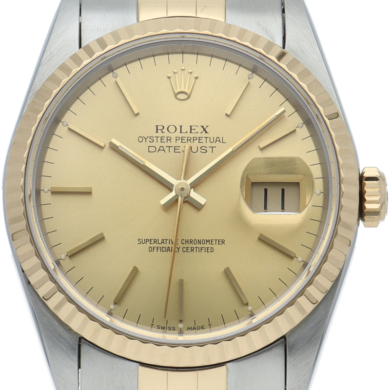 ロレックスのドレスウォッチの王道「デイトジャスト」。イエローゴールドとステンレスの組み合わせが上品で高級感を感じさせる1本です。