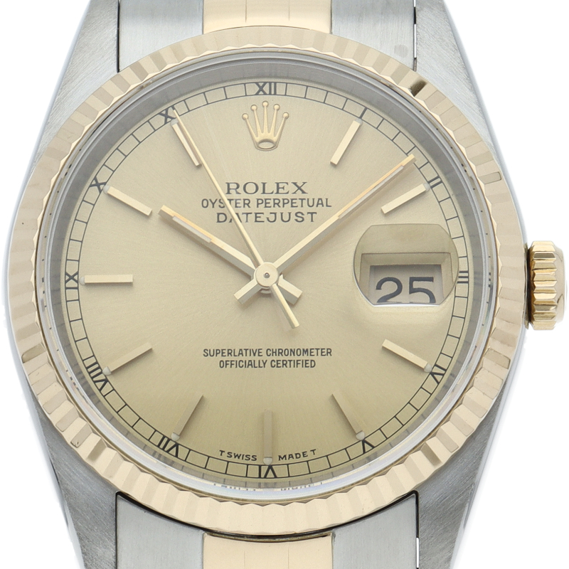 ロレックスのドレスウォッチの王道「デイトジャスト」。イエローゴールドとステンレスの組み合わせが上品で高級感を感じさせる1本です。