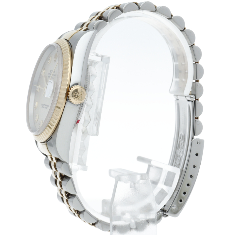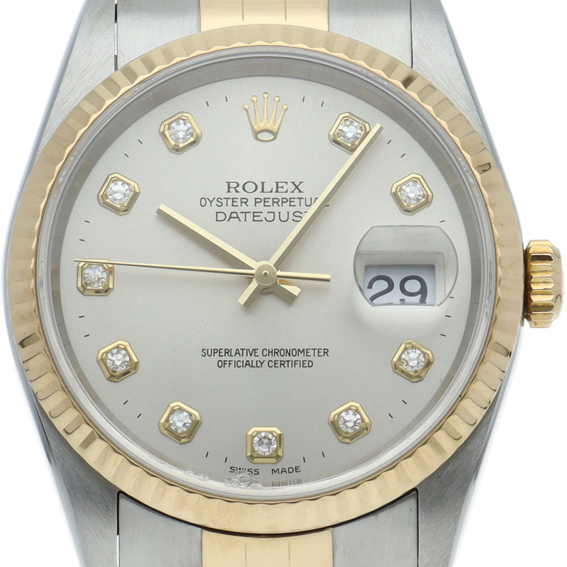 ロレックスのドレスウォッチで幅広い年齢層に愛されている「デイトジャスト」。イエローゴールドとステンレスのコンビ仕様に10Pダイヤが施されております。