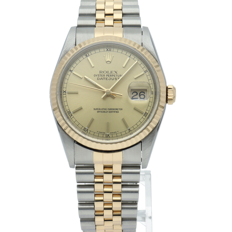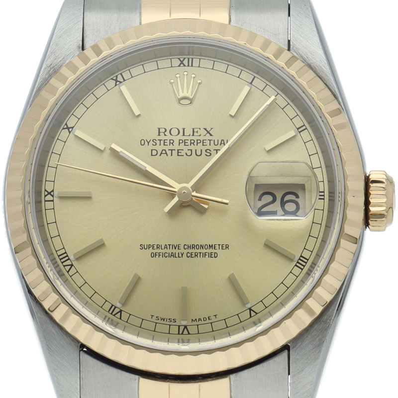 ロレックスのドレスウォッチの王道「デイトジャスト」。イエローゴールドとステンレスの組み合わせが上品で高級感を感じさせる1本です。