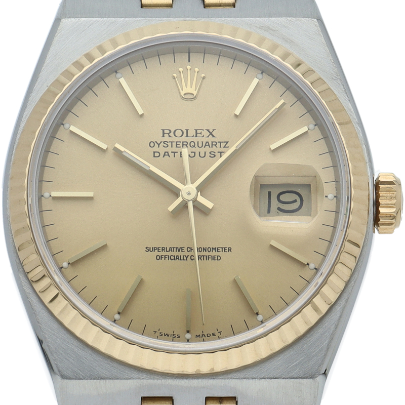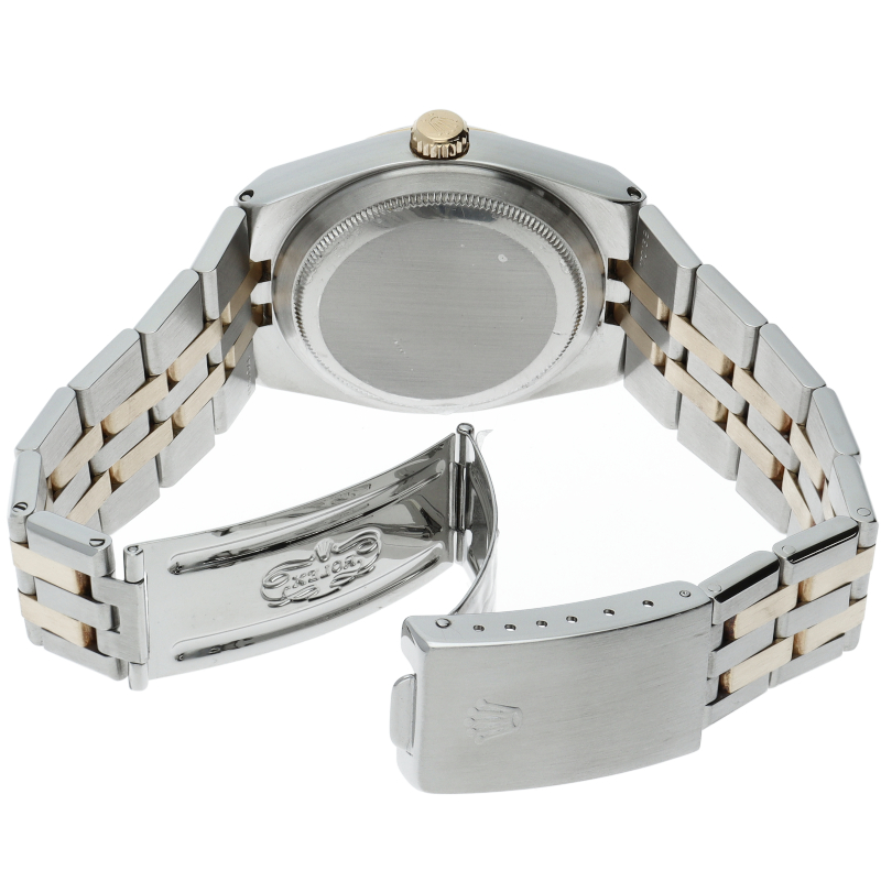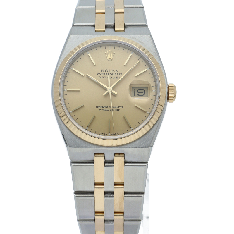 「デイトジャスト」のクォーツ仕様という珍しいモデルで「オイスタークォーツ」です。現行にはない直線的なケースとブレスのフォルムが印象的で貴重な1本。