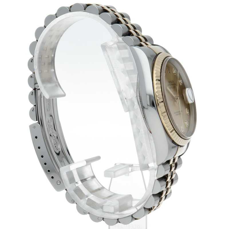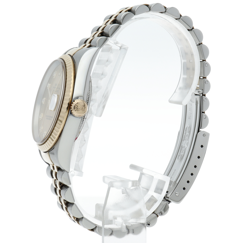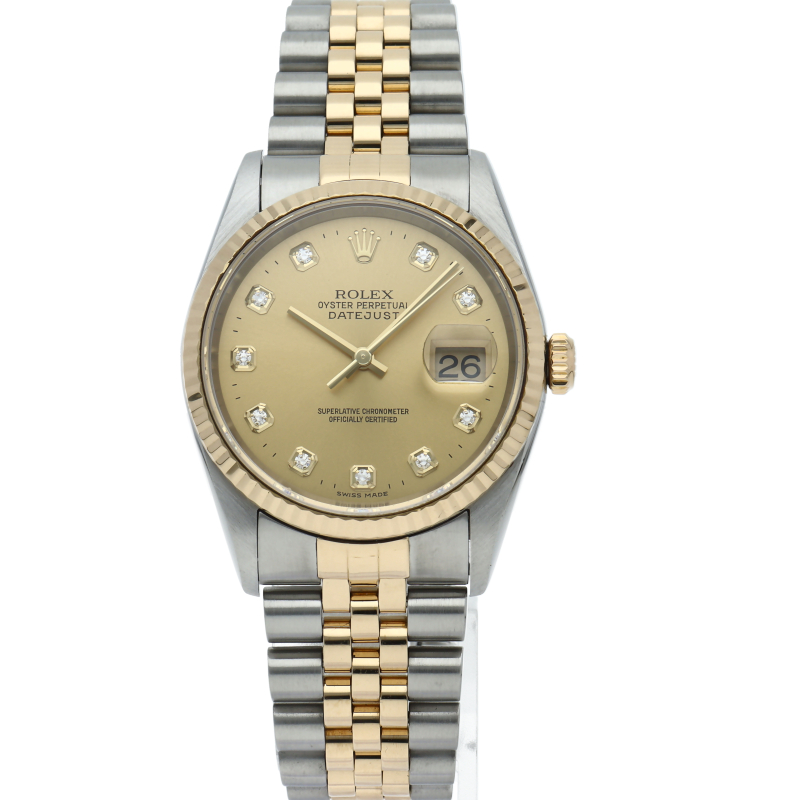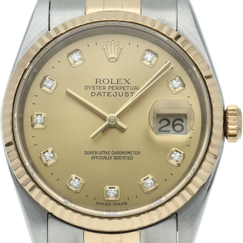 ロレックスのドレスウォッチで幅広い年齢層に愛されている「デイトジャスト」。イエローゴールドとステンレスのコンビ仕様に10Pダイヤが施されております。