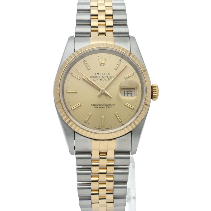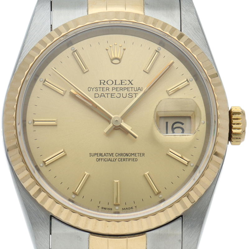 ロレックスのドレスウォッチの王道「デイトジャスト」。イエローゴールドとステンレスの組み合わせが上品で高級感を感じさせる1本です。