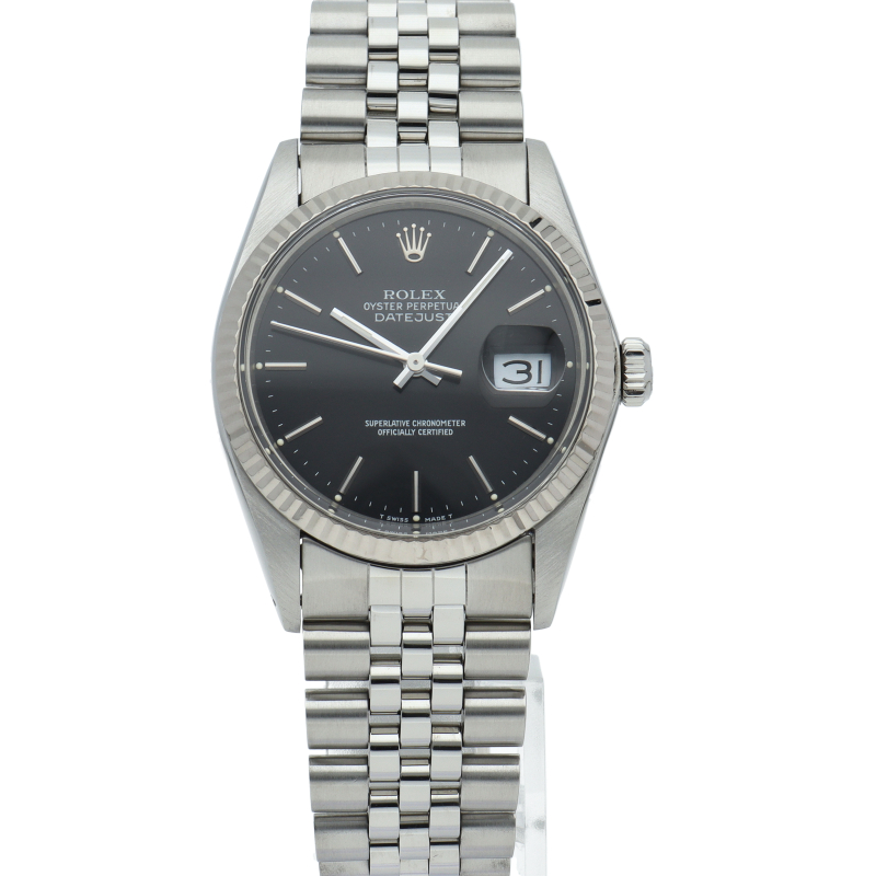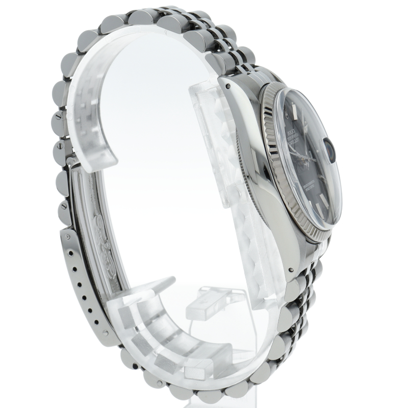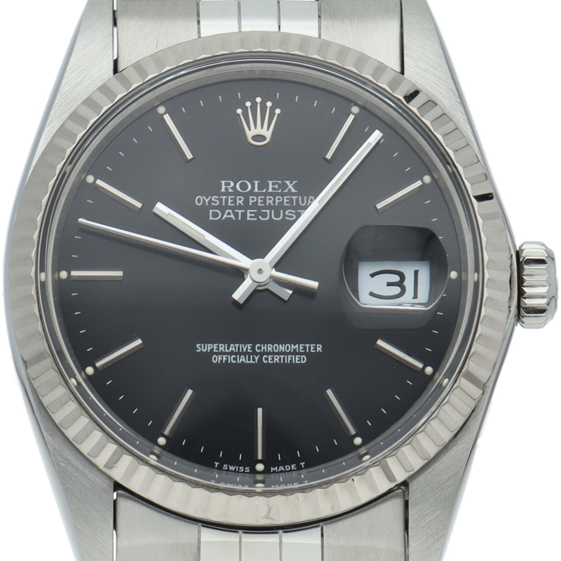 ロレックスのドレスウォッチの王道「デイトジャスト」。ホワイトゴールドとステンレスの組み合わせが高級感を感じさせる1本です。プラスチック風防仕様。