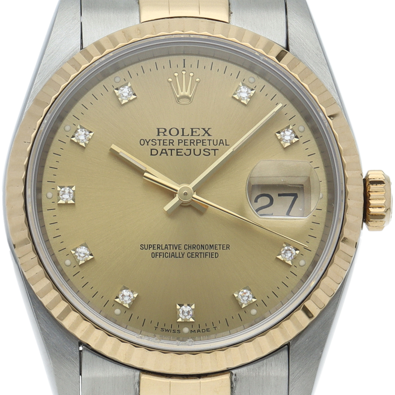 ロレックスのドレスウォッチの王道「デイトジャスト」。イエローゴールドとステンレスの組み合わせが上品で高級感を感じさせる1本です。