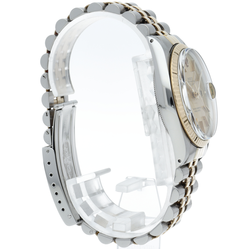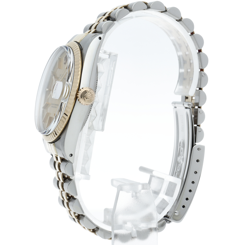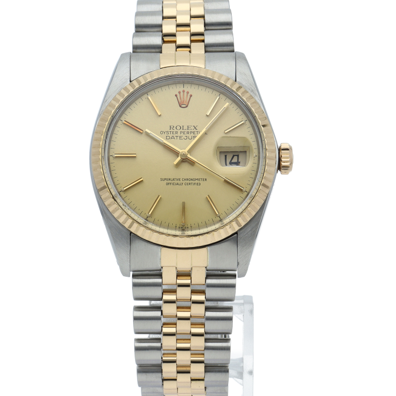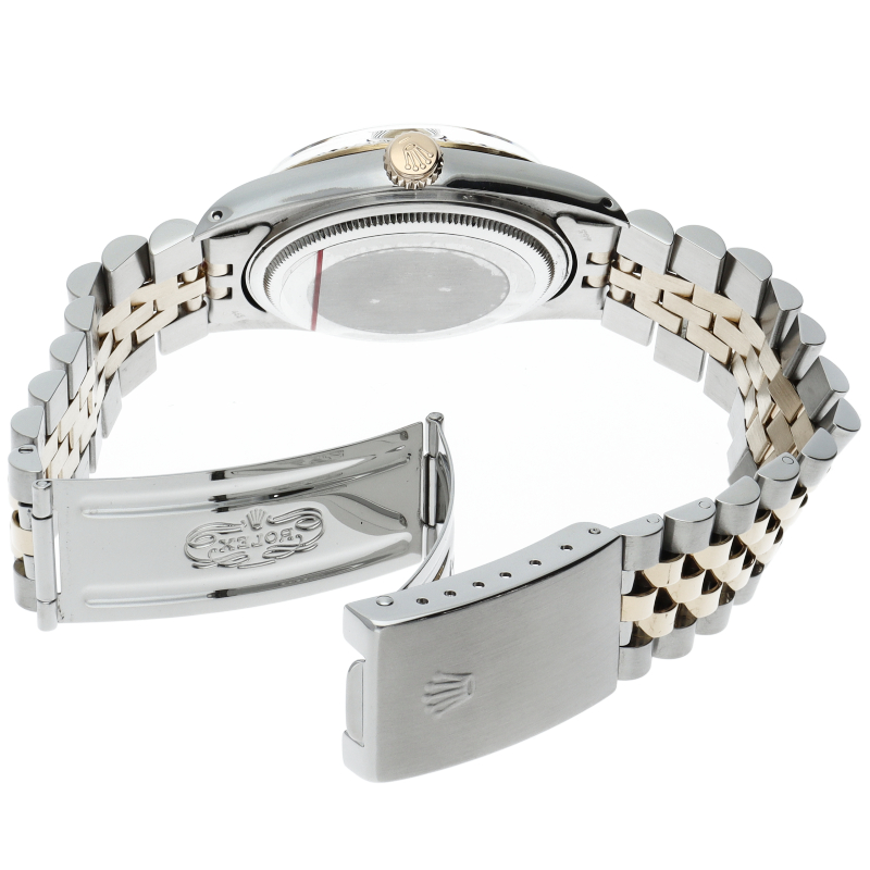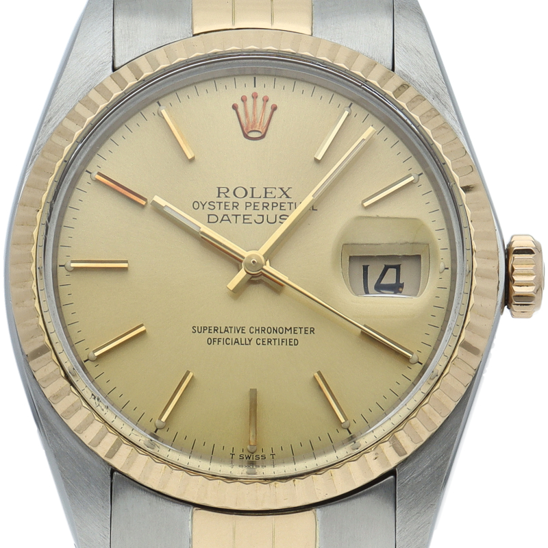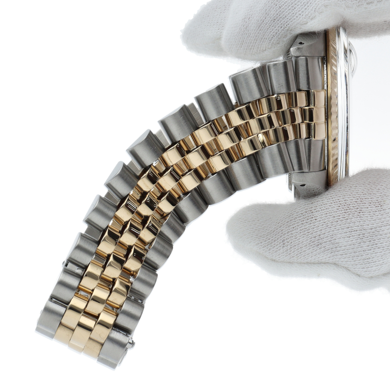 ロレックスドレスウォッチの王道「デイトジャスト」。イエローゴールドとステンレスの組み合わせが高級感を感じさせる1本です。プラスチック風防仕様。