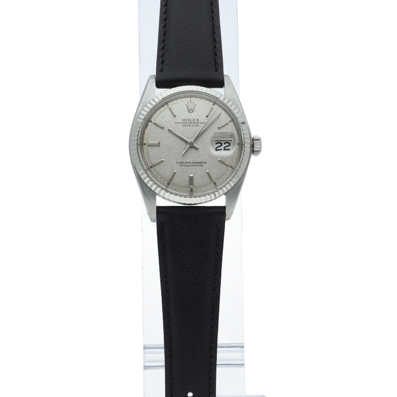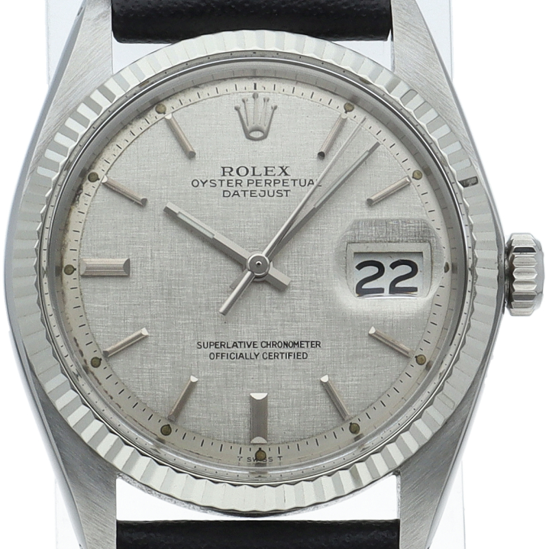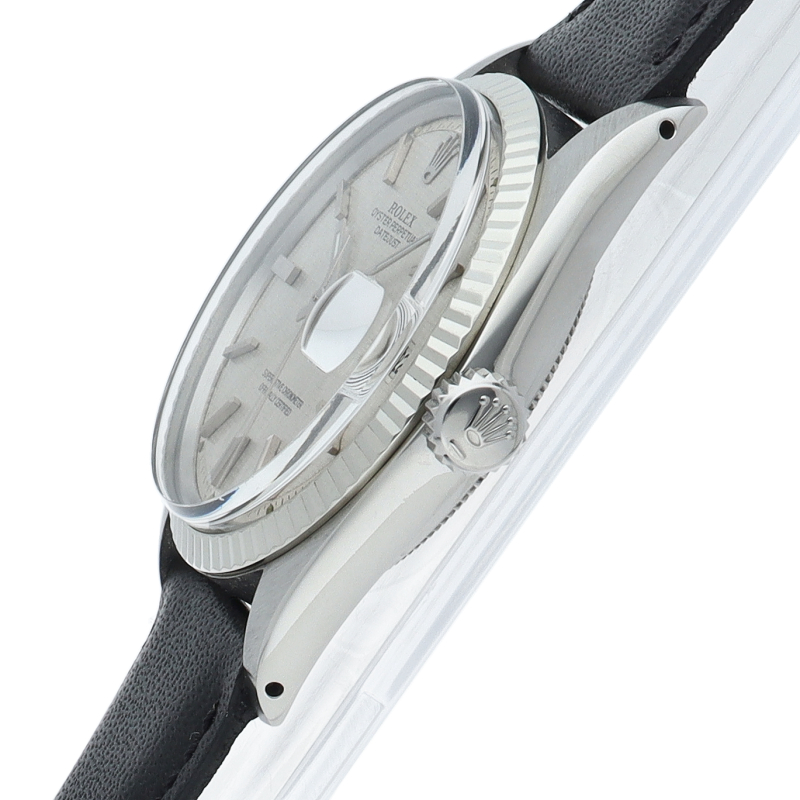 ロレックスのドレスウォッチの王道「デイトジャスト」。ホワイトゴールドとステンレスの組み合わせが高級感を感じさせる1本です。プラスチック風防仕様。