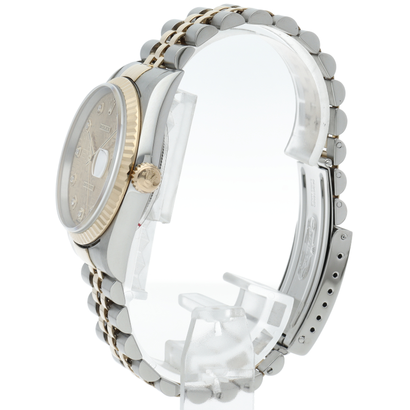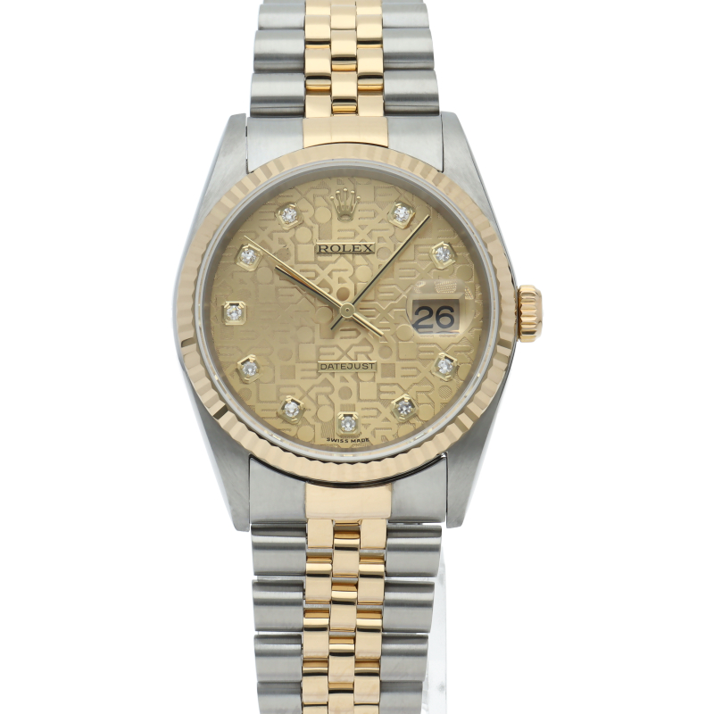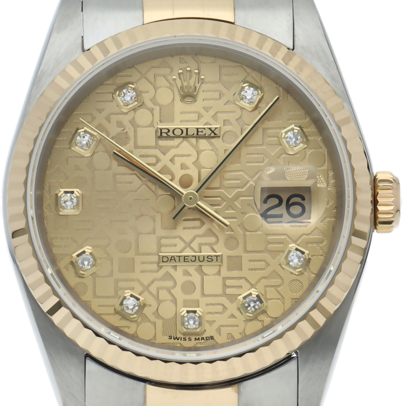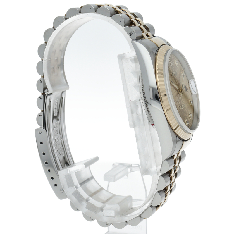 ロレックスのドレスウォッチで幅広い年齢層に愛されている「デイトジャスト」。イエローゴールドとステンレスのコンビ仕様に10Pダイヤが施されております。