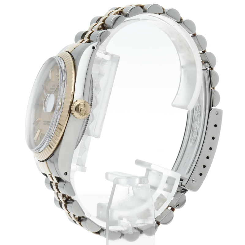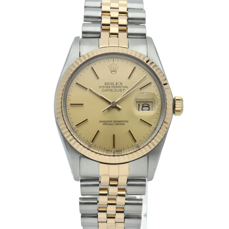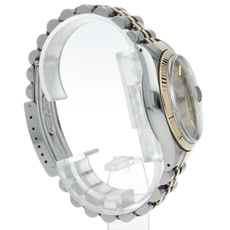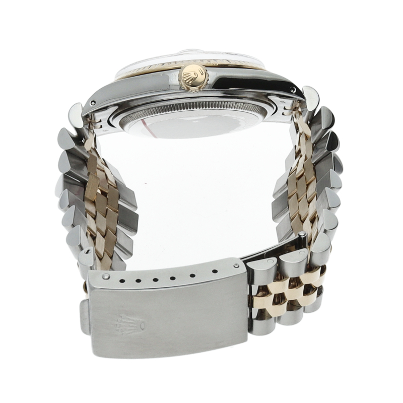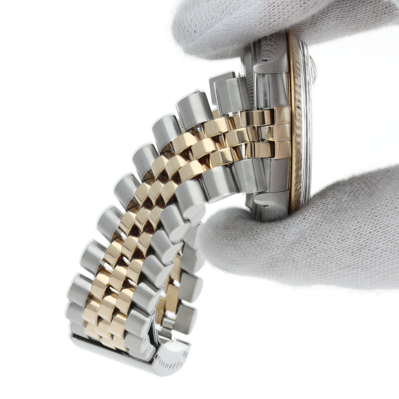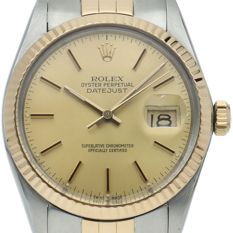 ロレックスドレスウォッチの王道「デイトジャスト」。イエローゴールドとステンレスの組み合わせが高級感を感じさせる1本です。プラスチック風防仕様。