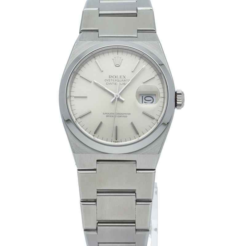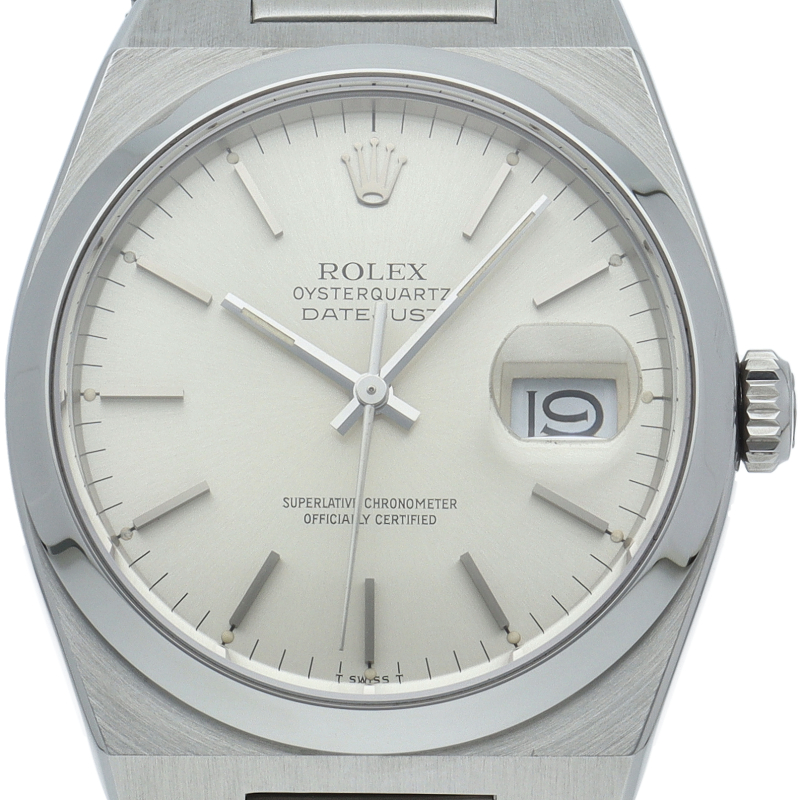 「デイトジャスト」のクォーツ仕様という珍しいモデルで「オイスタークォーツ」です。現行にはない直線的なケースとブレスのフォルムが印象的で貴重な1本。