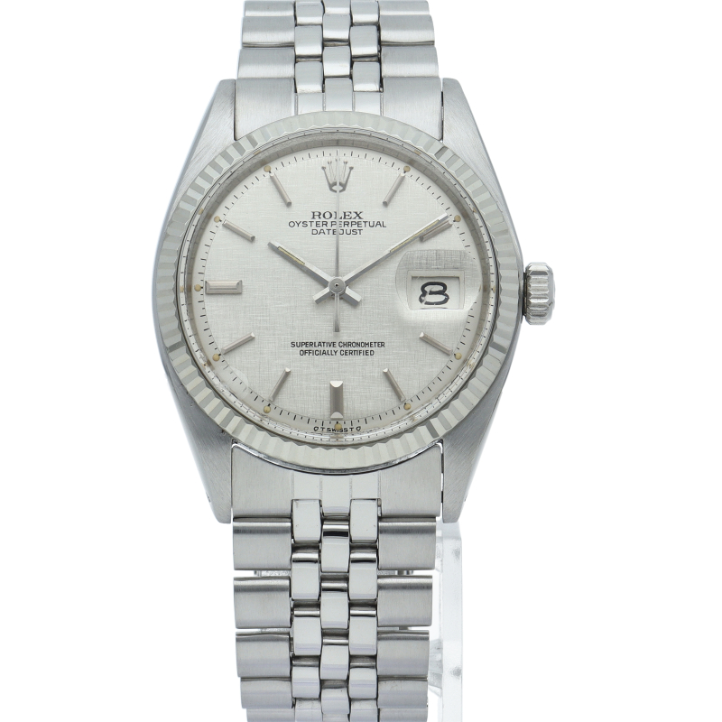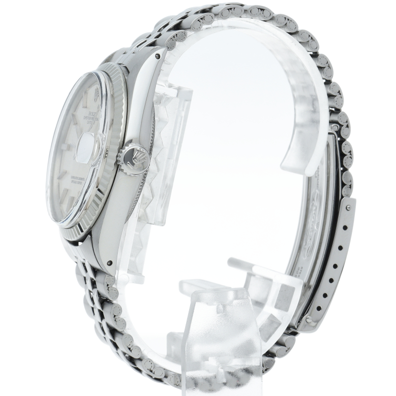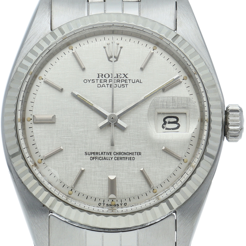 ロレックスのドレスウォッチの王道「デイトジャスト」。ホワイトゴールドとステンレスの組み合わせが高級感を感じさせる1本です。プラスチック風防仕様。