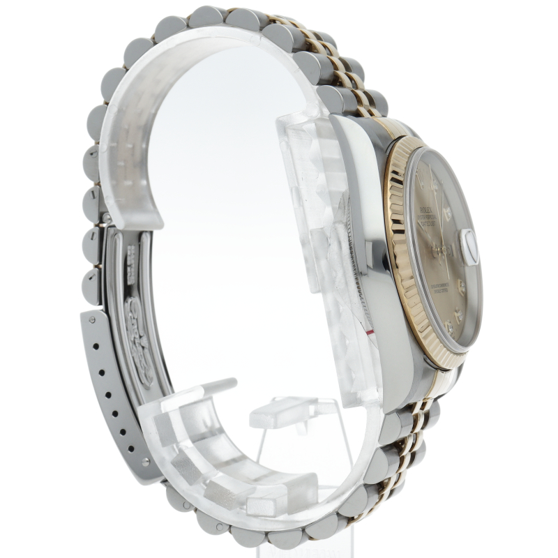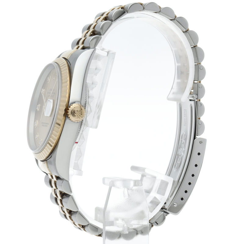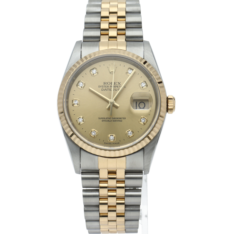 ロレックスのドレスウォッチで幅広い年齢層に愛されている「デイトジャスト」。イエローゴールドとステンレスのコンビ仕様に10Pダイヤが施されております。