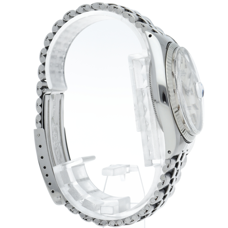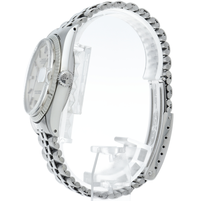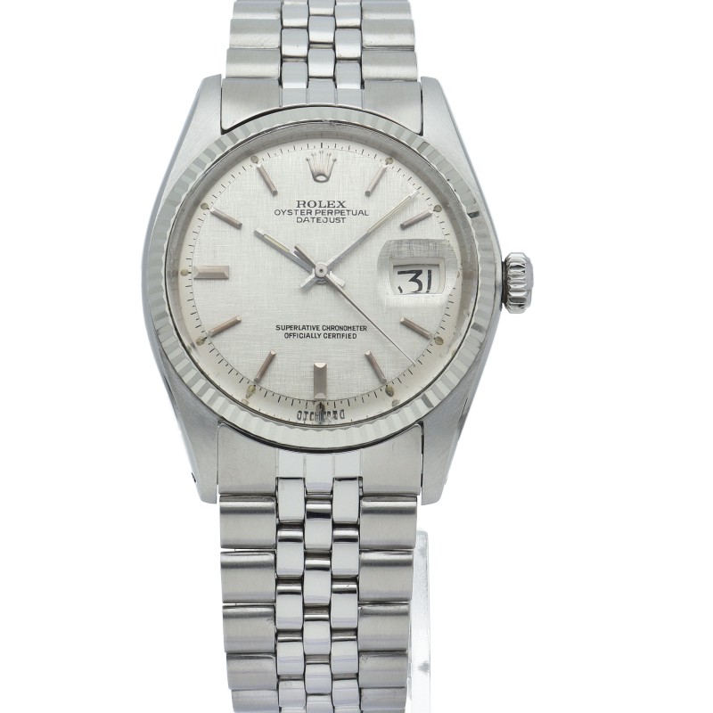 ロレックスのドレスウォッチの王道「デイトジャスト」。ホワイトゴールドとステンレスの組み合わせが高級感を感じさせる1本です。プラスチック風防仕様。