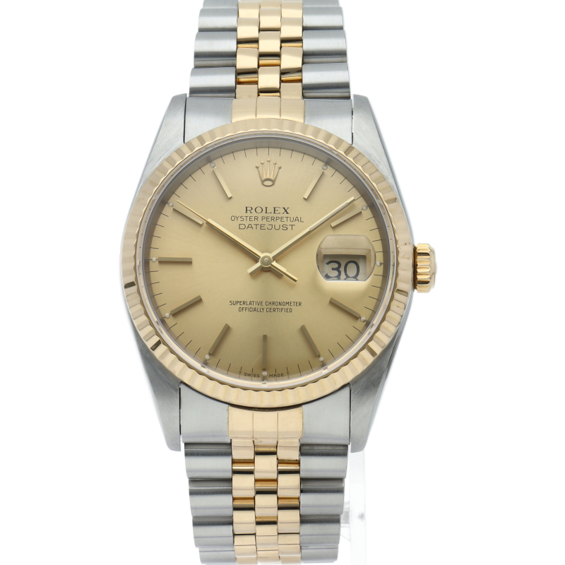 ロレックスのドレスウォッチの王道「デイトジャスト」。イエローゴールドとステンレスの組み合わせが上品で高級感を感じさせる1本です。