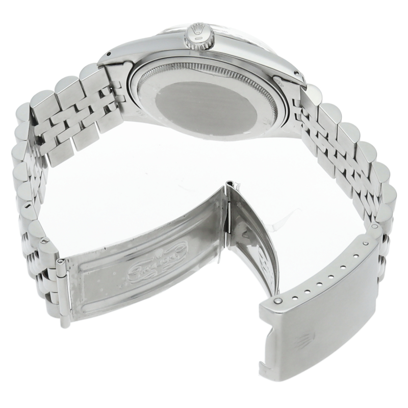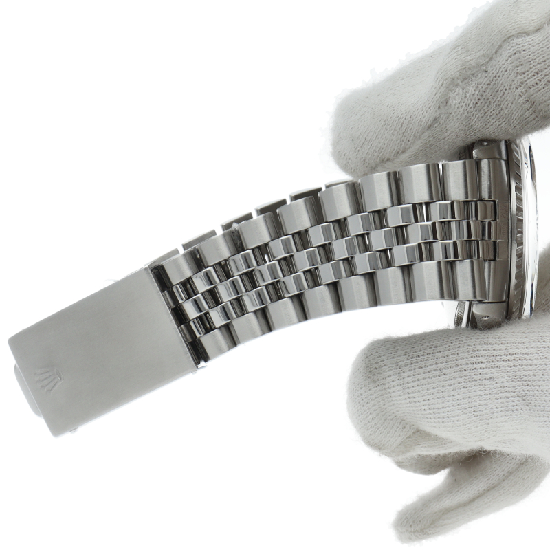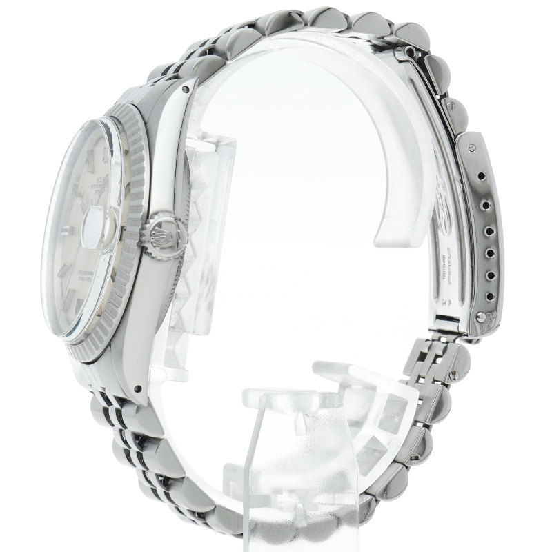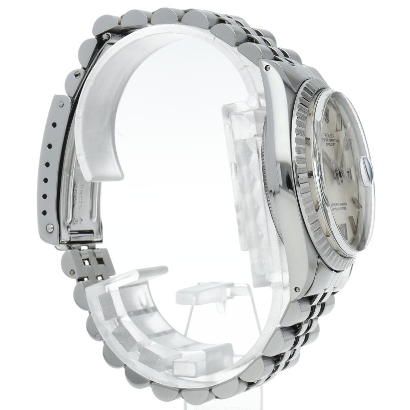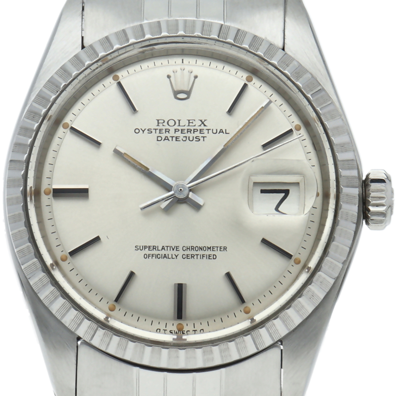 ロレックス「デイトジャスト」(Ref.1603)。SS素材のエンジンターンドベゼルが渋いヴィンテージモデル。最大の特徴は、6時位置のクロノメーター表記の空白が上下で一直線に揃う「センタースプリット(レイルダイヤル)」。通常個体とは異なる希少なディテールであり、コレクター心をくすぐるこだわりの一本です。