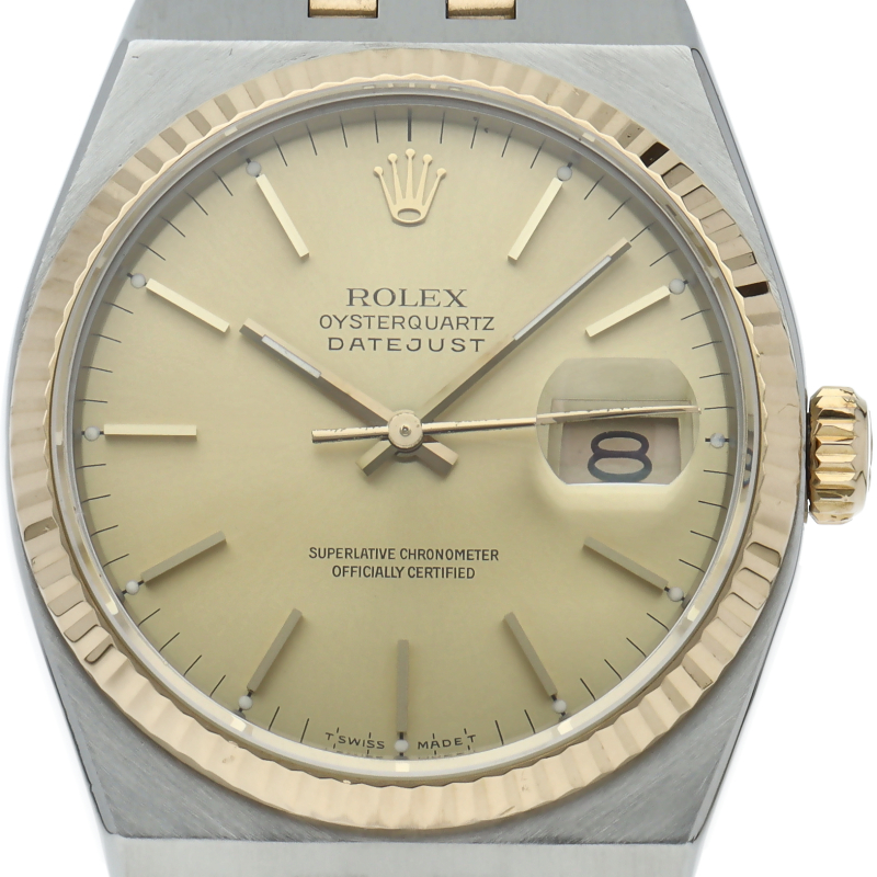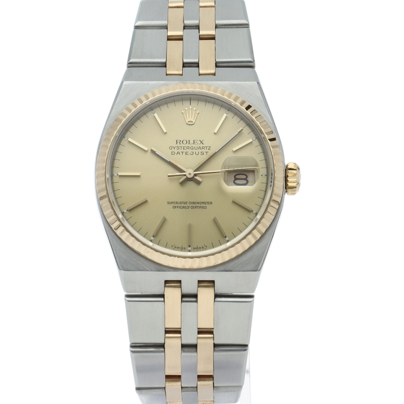「デイトジャスト」のクォーツ仕様という珍しいモデルで「オイスタークォーツ」です。現行にはない直線的なケースとブレスのフォルムが印象的で貴重な1本。